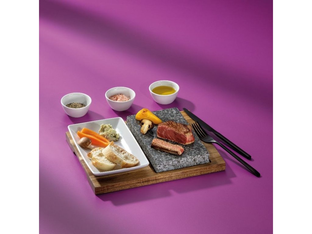 Sada skládající se z žulového talíře 20x12x2,5cm h s deskou z akáciového dřeva 29 x 23 x 2cm h včetně 3 bílých keramických misek 7x3cm h 1 bílý keramický talíř 20x13x3cm h