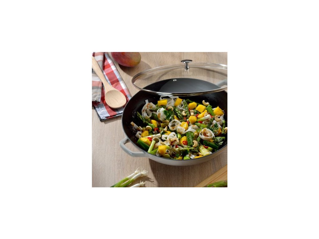 Trendy nádobí s dlouhou životností ze série Kela Calido: Velký wok o průměru 36 cm a zvenčí lesklým povrchem bude vaším novým spolehlivým společníkem v kuchyni, když jde o zdravou a šetrnou přípravu vašich pokrmů. Tento šedý wok je vyroben z litiny a má uvnitř černý a hrubý smalt. Wok lze používat až do 220 °C a je vhodný na všechny typy sporáků. Wok se skleněnou poklicí je součástí rozsáhlé série nádobí Calido by Kela!Smaltovaná litina se skleněnou poklicí světle šedá/černá 36cm, 17cm v, 4L