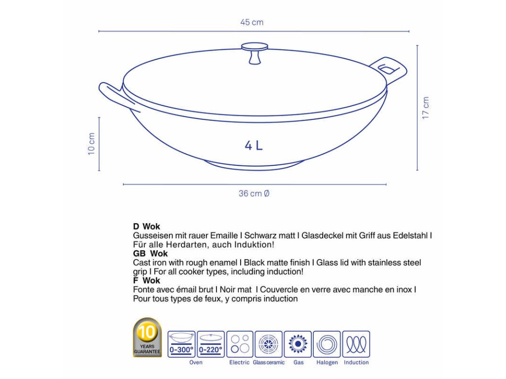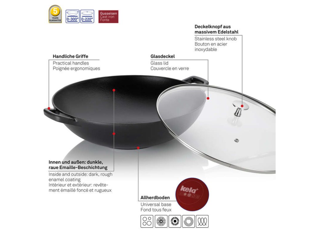 - velký asijský litinový wok- smaltovaný vnější i vnitřní povrch- smaltovaný povrch je velmi odolný a bezproblémový na údržbu, chrání nádobí před korozí a navíc je hygienický a vhodný pro zdravé vaření- přesně padnoucí skleněná poklice s úchopem z nerezové oceli- masivní litinové rukojeti- rychle a rovnoměrně rozvádí teplo po celém povrchu- vynikající odolnost vůči velmi vysokým teplotám- vhodný na všechny druhy sporáků i na indukci- vhodný do trouby až do 300°C (s poklicí do 220°C)- extrémně odolný wok s dlouhou životností - rozměry: 36 x 17 cm - objem: 4 l- Výhody smaltovaného litinového nádobí:- Excelentní tepelná vodivost- Úspornější a rychlejší příprava pokrmů- Odolný proti korozi- Dlouhotrvající nepřilnavý vnitřní povrch- Snadno omyvatelný- Zintenzivňuje chuť připravovaných pokrmů- Teplotní odolnost až do 300°C- Udržuje teplotu i po skončení vaření- Komplexní použití na všech druzích sporáků i v troubě- Neobsahuje žádné škodlivé látky- Dlouhá životnost- značka KELA