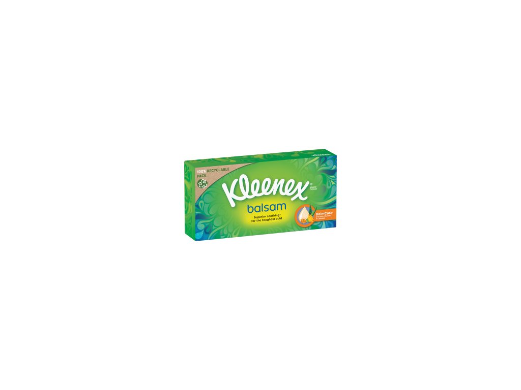 Kleenex Balsam jsou 3vrstvé papírové kapesníčky v krabičce s aloe vera, vitaminem E a extraktem z měsíčku lékařského pro každodenní použití. Pečují o pokožku v okolí nosu a jsou obzvláště vhodné i při silném nachlazení. Papírová krabička je 100% recyklovatelná.