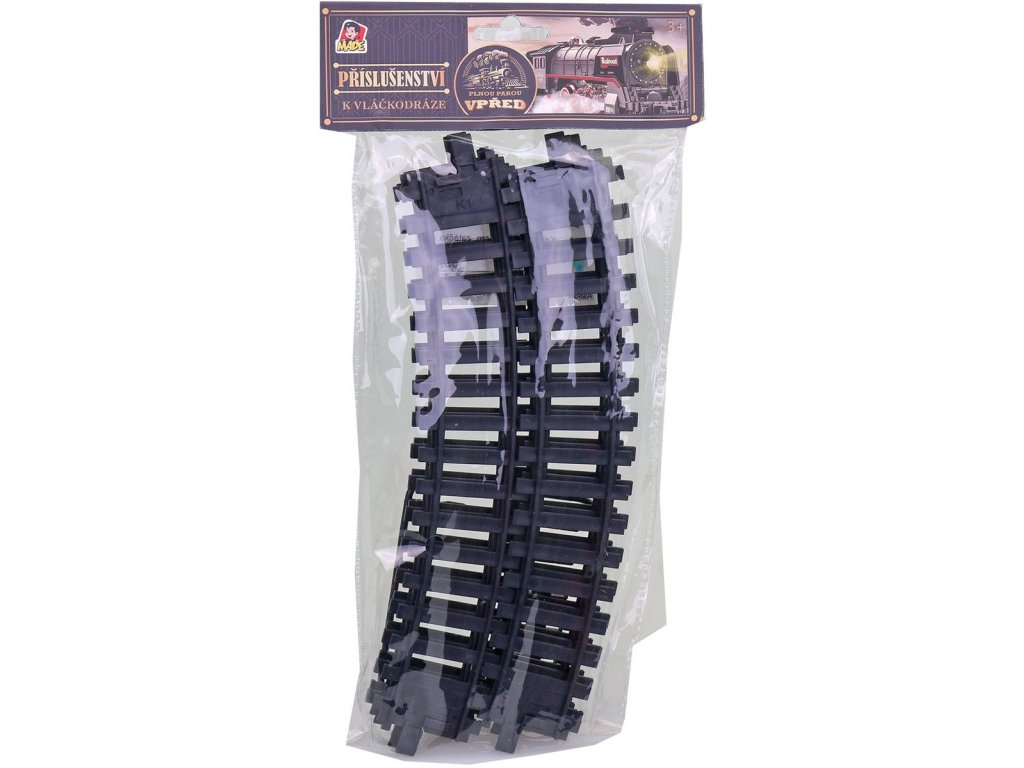 Náhradní koleje - doplněk k vláčku. Plastové kolejnice s doplňky. Součástí balení je zatočená kolej (oblouk) 6x a spojky 12x.