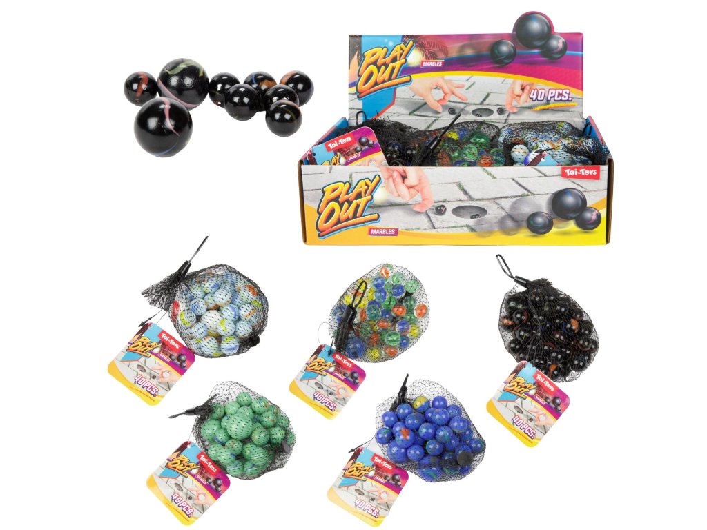 Kuličky skleněné cvrnkací různé velikosti 40ks mix barev v síťce 12ks v boxu
