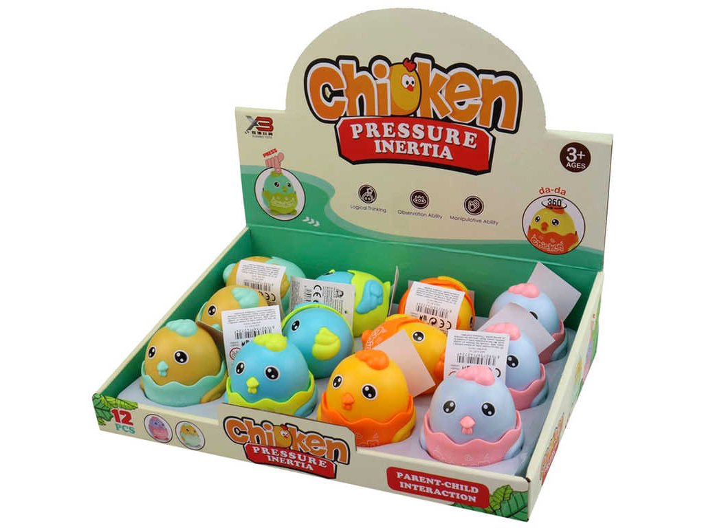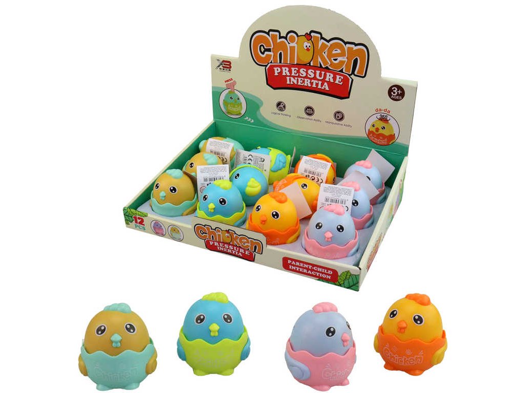 Roztomilé barevné kuřátko na setrvačník, ve čtyřech barevných kombinacích. Hlava otočná o 360 stupňů v jednotlivých krocích. Po stlačení vrchní části hlavičky (hřebínku) se kuřátko samo rozjede