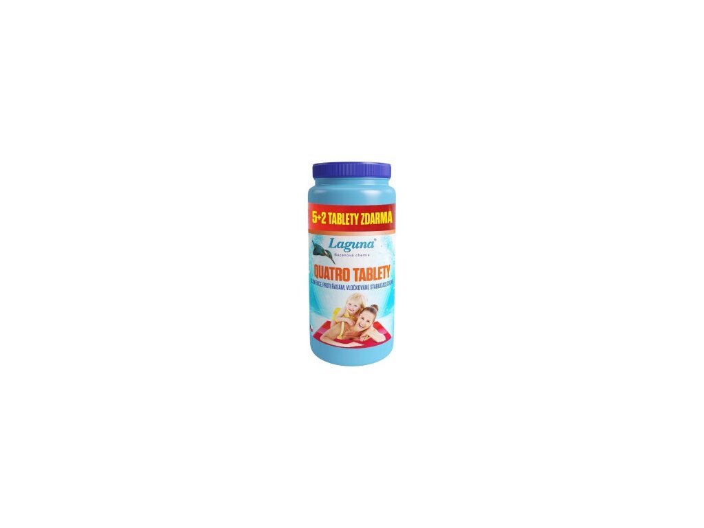 Laguna Quatro bazénová chemie je víceúčelový přípravek určený k pravidelné dezinfekci bazénové vody, zabránění vzniku řas, odstranění nečistot pomocí flokulace a stabilizaci chloru. LAGUNA QUATRO TABLETY je moderní víceúčelový přípravek pro celosezónní průběžnou údržbu vody ve všech typech bazénů. Likviduje baktérie a řasy, zabraňuje jejich růstu, umožňuje vyvločkování nečistot a stabilizuje aktivní chlór.