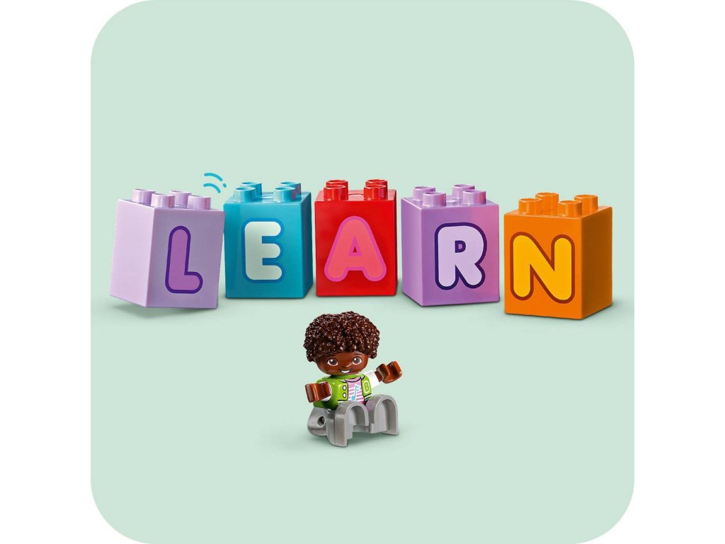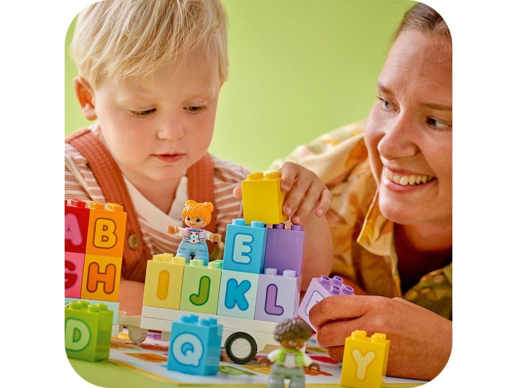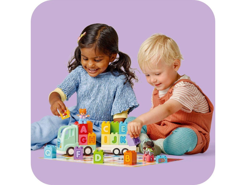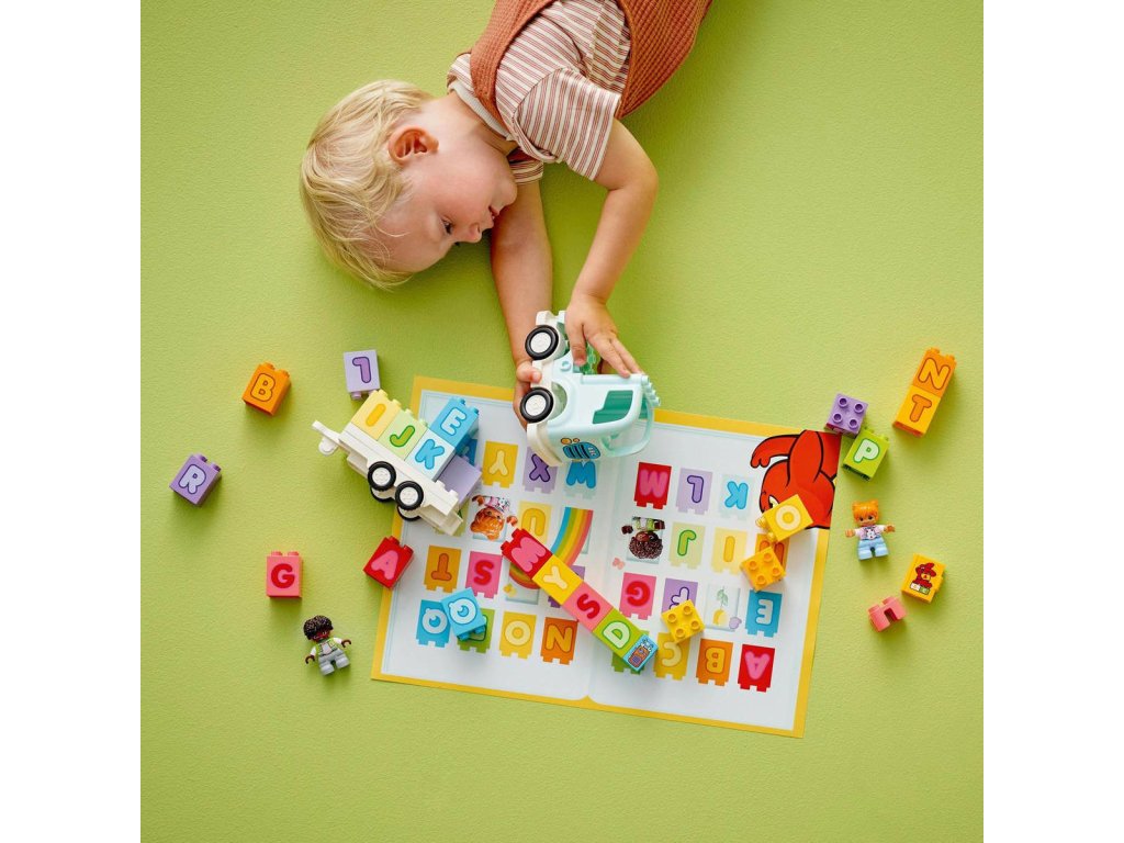 Stavebnice Náklaďák s abecedou malým dětem pomůže naučit se poznávat písmenka. Tato kreativní hračka s abecedou přináší spoustu možností učení hrou. Malé děti si vyzkouší připojení přívěsu k náklaďáku, pomohou 2 figurkám LEGO DUPLO naskládat a vyskládat kostky a naučí se rozpoznávat písmena, barvy, zdokonalí mluvení a procvičí si jemné motorické schopnosti. Ve stavebnici LEGO DUPLO s písmenky na děti čeká řada nápaditých doplňků, včetně knížky a sterea, které malé stavitele povzbuzují k recitování abecedy společně s rodiči. Tato vzdělávací hračka inspiruje batolata k vymýšlení kreativních příběhů. Za volantem modelu náklaďáku čekají nápaditá dobrodružství!