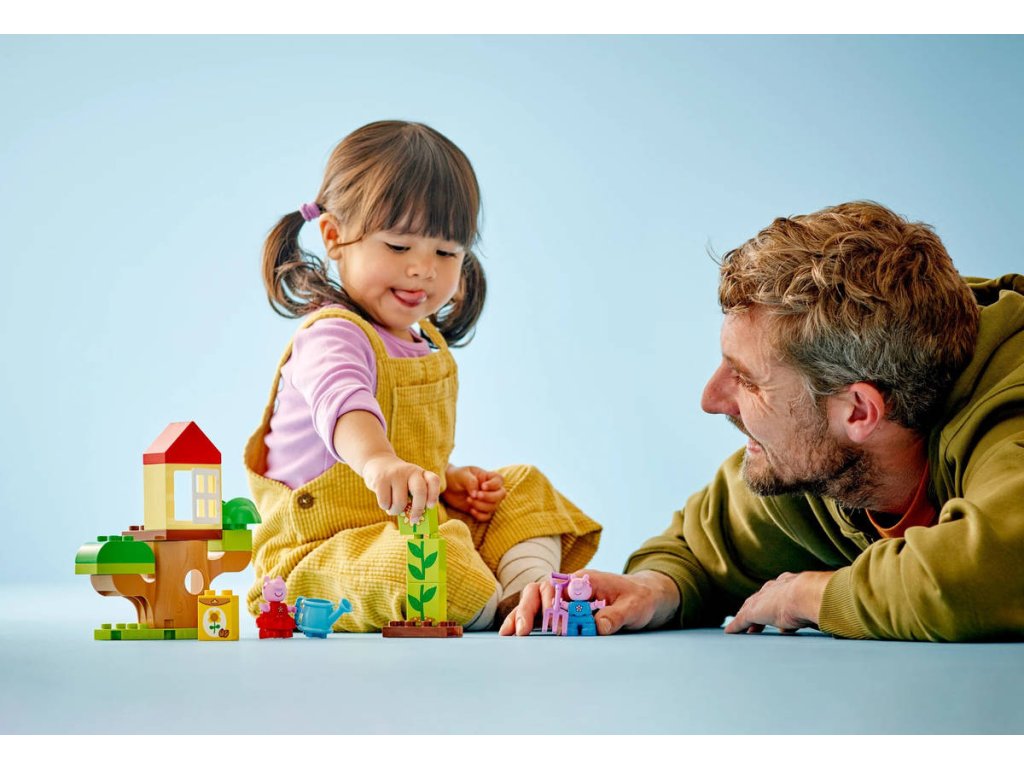 Děti od 2 let se se stavebnicí LEGO DUPLO Prasátko Peppa – zahrada a dům na stromě vydají na dobrodružství venku. Tato stavebnice prohloubí lásku nejmenších dětí k přírodě. Začínající stavitelé si zahrají na den strávený na zahradě a pomůžou Peppě a Tomovi vypěstovat slunečnici. Tato hračka na stavění a přestavování obsahuje spoustu kreativních doplňků, včetně konvičky a vidlí, které inspirují malé fanoušky prasátka Peppy. Děti procvičí jemnou motoriku a schopnost třídění a uspořádají kostky tak, aby znázornily, že model květiny roste. Poté se 2 figurky budou hrát na schovávanou v kmeni stromu nebo si oddechnou v domku na stromě. Tato vzdělávací hračka LEGO DUPLO Prasátko Peppa pomáhá malým dětem prohloubit celou řadu dovedností – od řešení problémů a vytrvalosti při pěstování rostlinky až po péči o přírodu a sebevyjádření, když si hrají na Peppu a Toma, kteří spolu pracují a hrají si na zahradě.