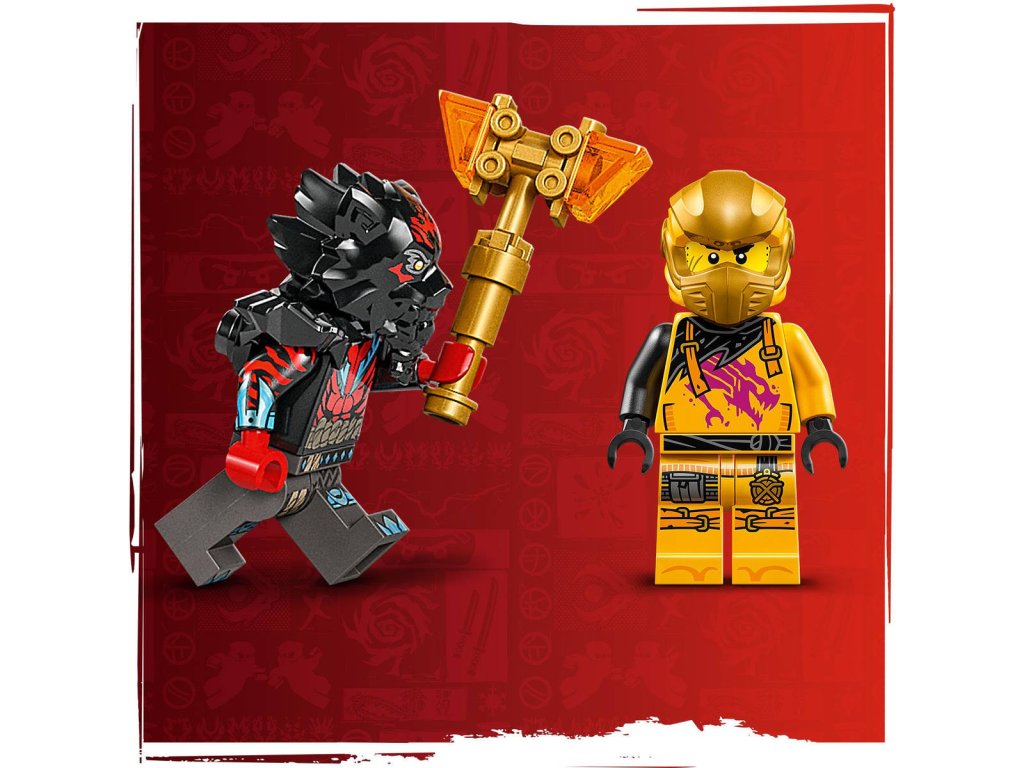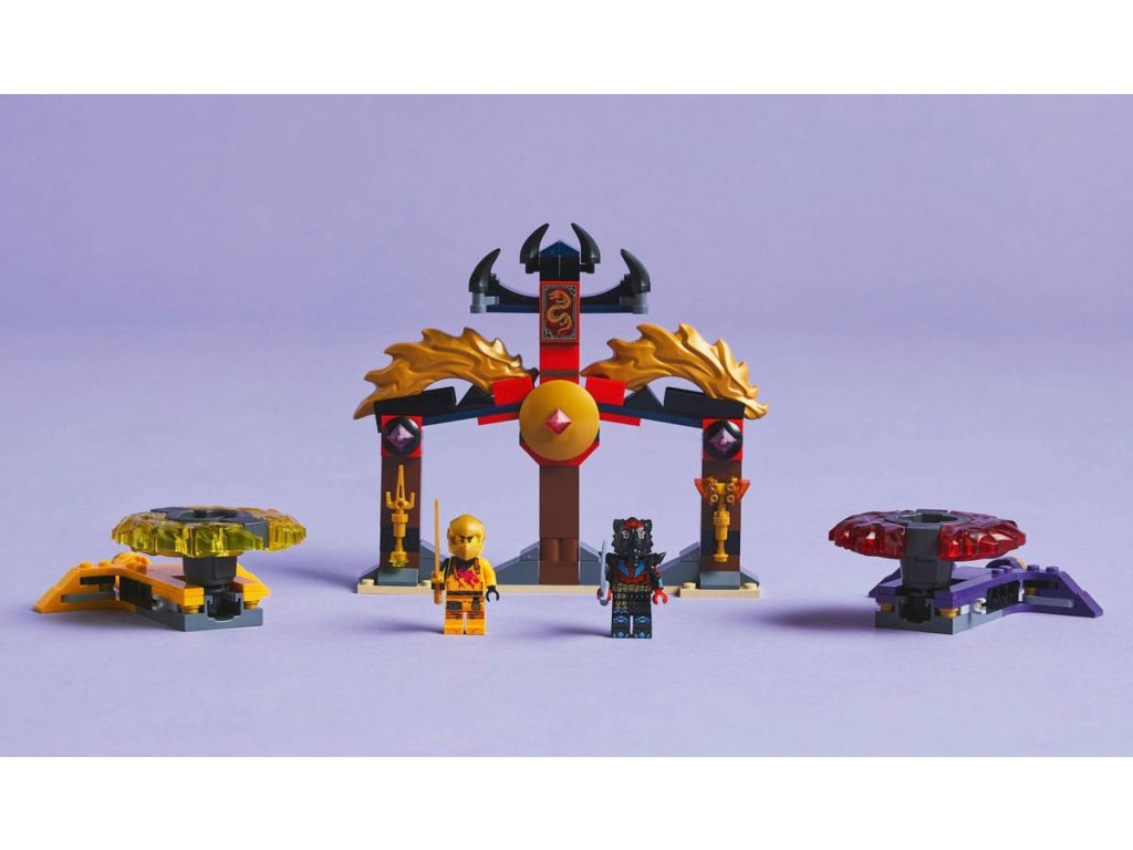 S akční stavebnicí Bitevní balíček dračího Spinjitzu si kluci a holky od 6 let připomenou úžasné akční scény ze 3. řady televizního seriálu NINJAGO Dračí povstání. Tato malá akční stavebnice LEGO obsahuje model chrámu s bojovou arénou, 2minifigurky Arina a Rase a 2 dračí Spinjitzu spinnery, které děti umístí do odpalovačů a během bitev je proto sobě vystřelovat. Děti si vychutnají napínavé dobrodružné souboje dobra proti zlu s Arinovým žlutým spinnerem a Rasovým červeným spinnerem, kt eré mají odnímatelné dílky síly. Tyto postavy ze světa NINJAGO můžou své spinnery vylepšovat zlatými prvky, které můžou vyhrát zasažením a zničením bojové arény.