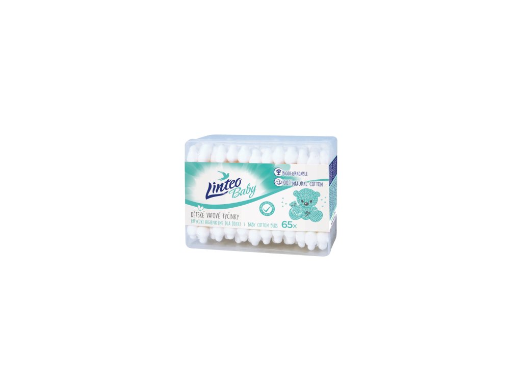 Vatové tyčinky Linteo Baby jsou speciálně navrženy pro dětská ouška. Díky pevnému návinu jsou i pro nejmenší děti bezpečná. Jedno balení obsahuje 65 ks vatových tyčinek, které jsou uložené v praktickém boxu.