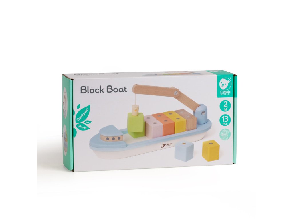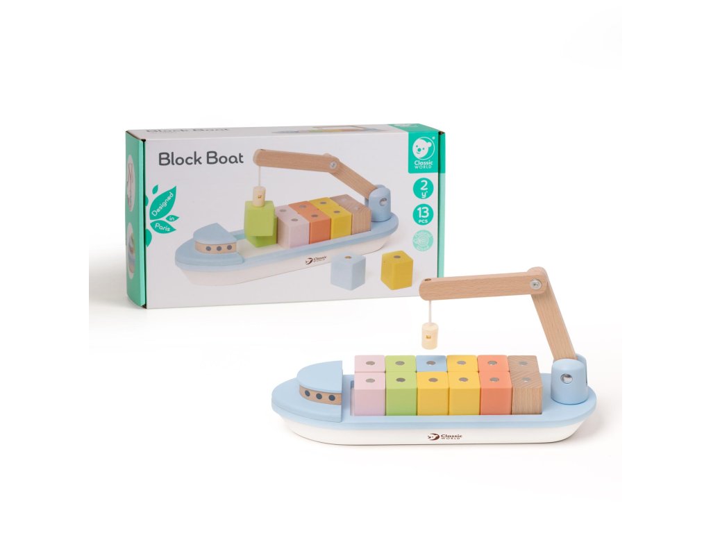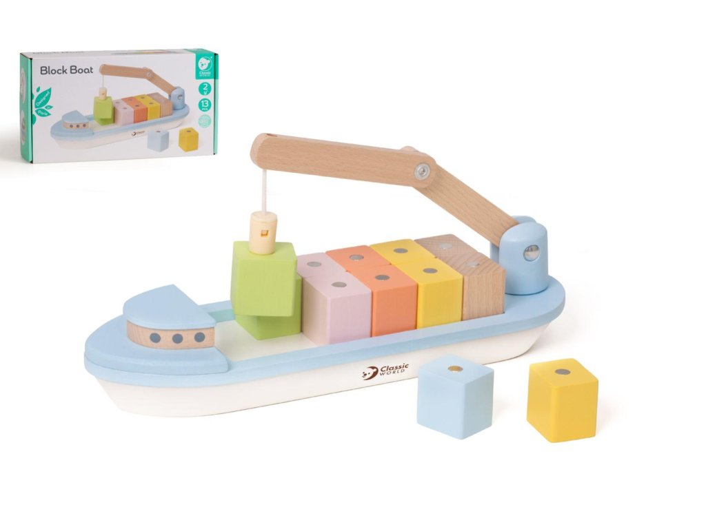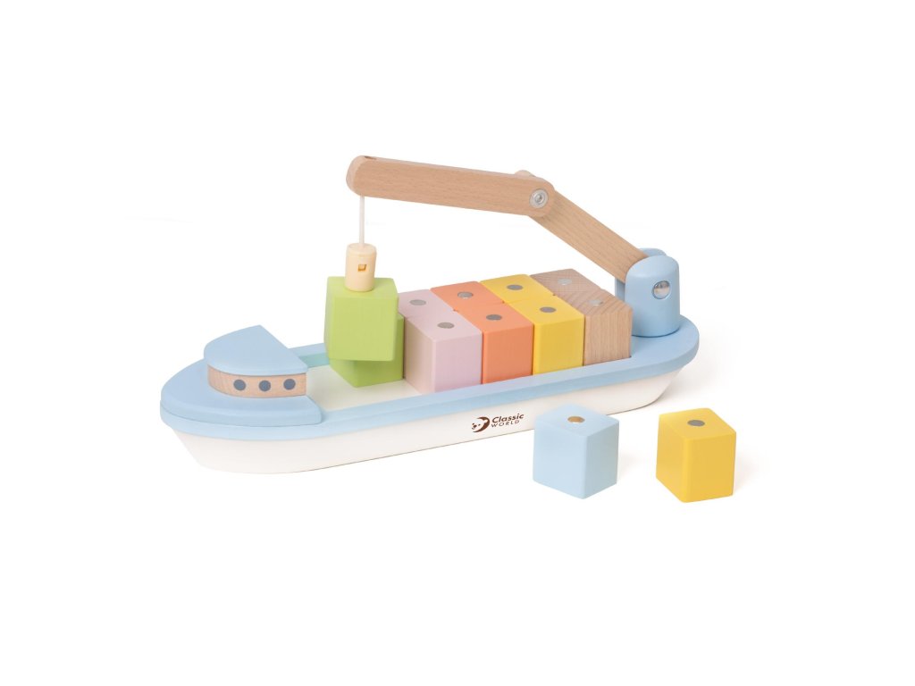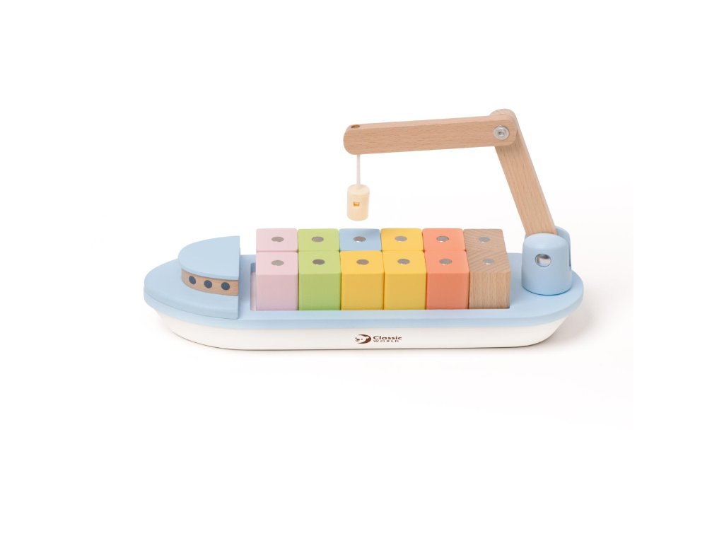 Zábavná malá nákladní loď, naložená pastelově barevným zbožím. Loď má 12 barevných magnetických bloků a děti je mohou libovolně nakládat a vykládat posunutím flexibilního jeřábu. Barevná loď poskytne hodiny nápadité zábavy pro vaše batole, zlepší jeho obratnost a koncentraci.