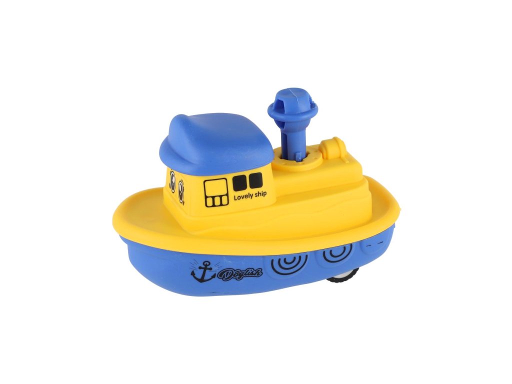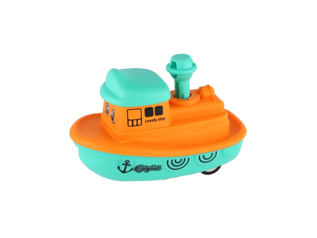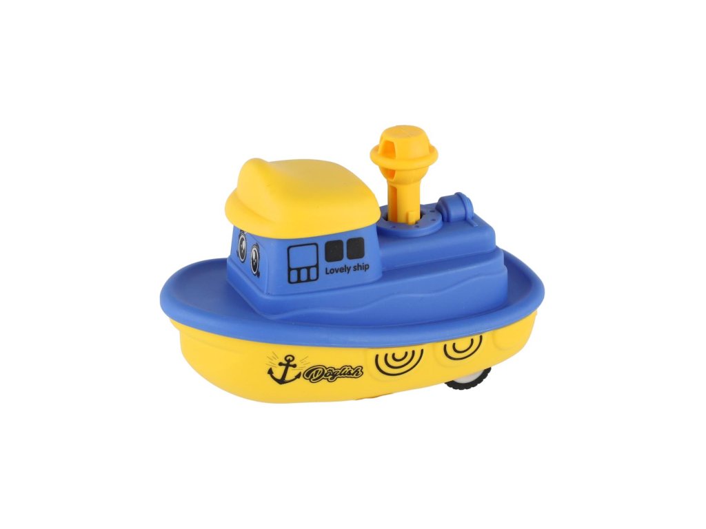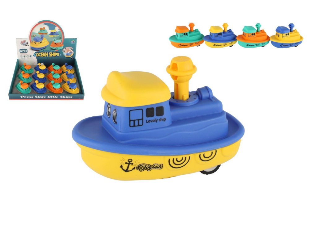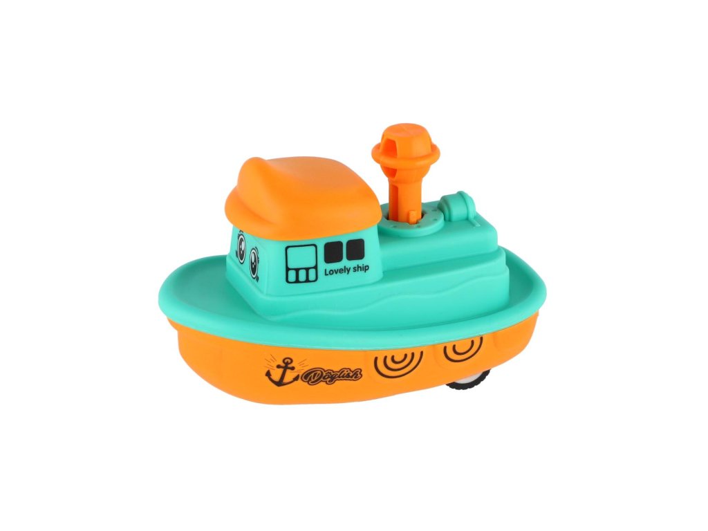 Malá, ale rychlá! Tato barevná plastová lodička s funkcí „Zmáčkni a jeď“ potěší všechny malé kapitány. Díky setrvačníku se snadno ovládá – stačí zmáčknout komín a pustit.