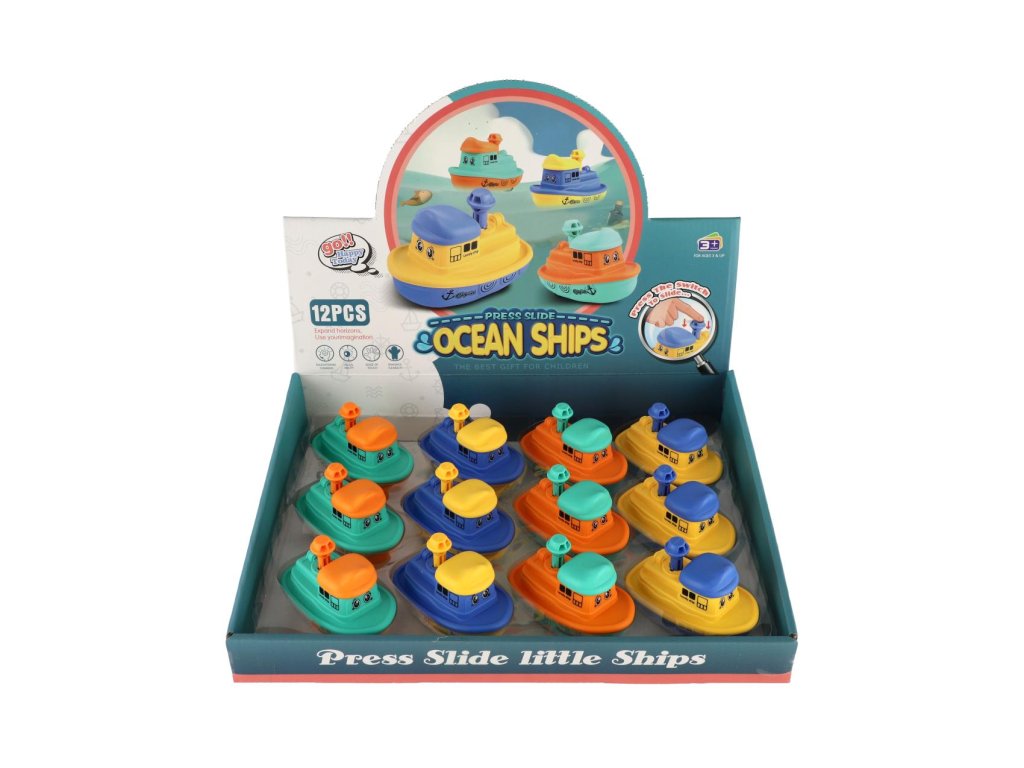 Loď/Lodička Zmáčkni a jeď plast 5x10cm na setrvačník 4 barvy 12ks v boxu
