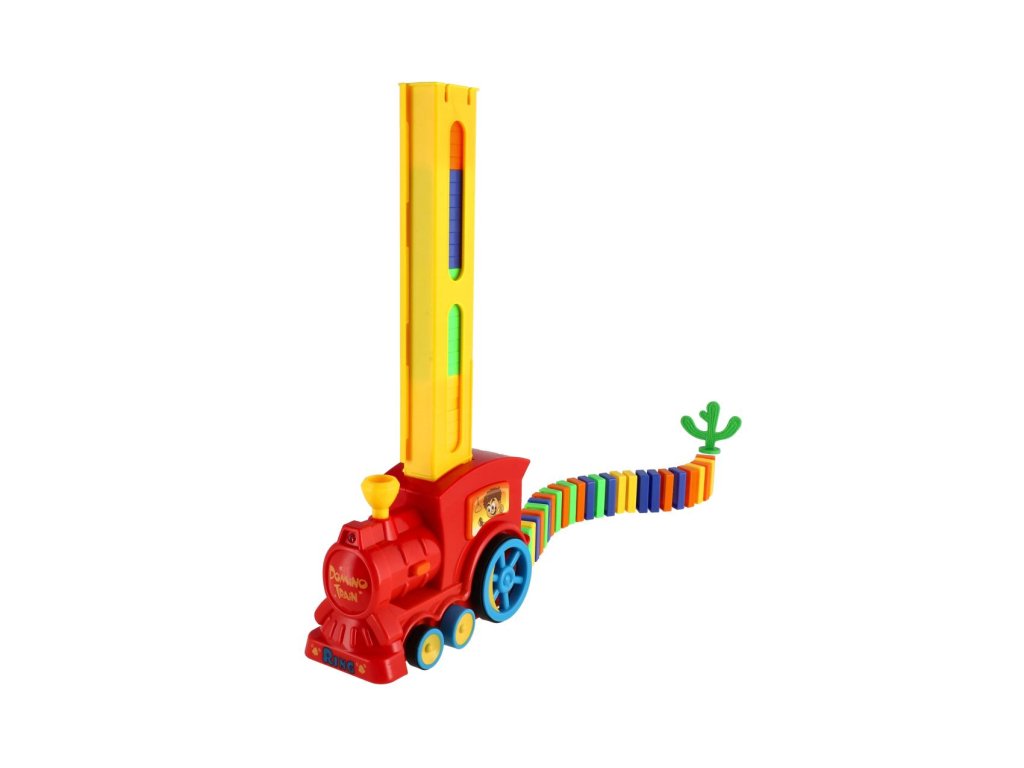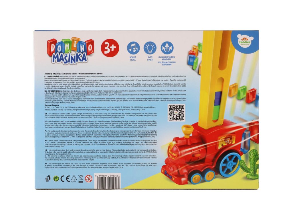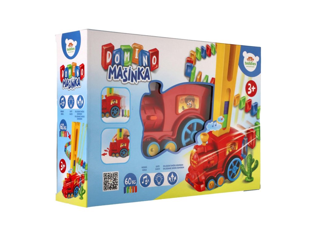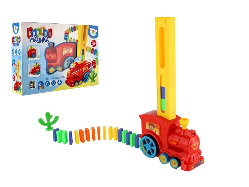 Lokomotiva skládající barevné domino 60ks. Vláček za jízdy staví řadu z domina, kterou můžete zbourat. Při nárazu vláček změní směr jízdy a jede dál, otočením komínku mašinky změníte směr, při jízdě svítí a cinká. Baterie 2x AA nejsou součástí balení.