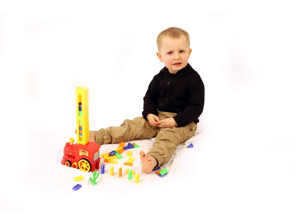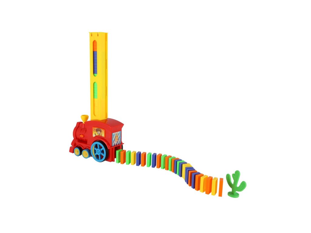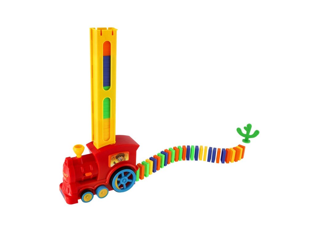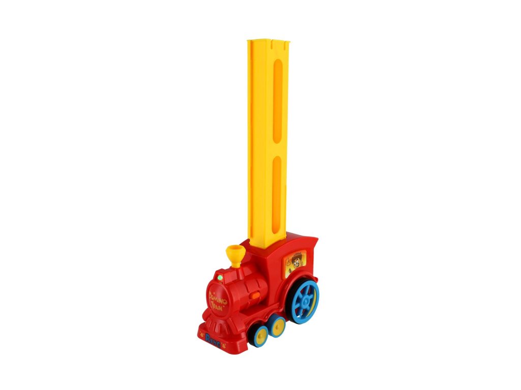 Lokomotiva skládající barevné domino 60ks. Vláček za jízdy staví řadu z domina, kterou můžete zbourat. Při nárazu vláček změní směr jízdy a jede dál, otočením komínku mašinky změníte směr, při jízdě svítí a cinká. Baterie 2x AA nejsou součástí balení.
