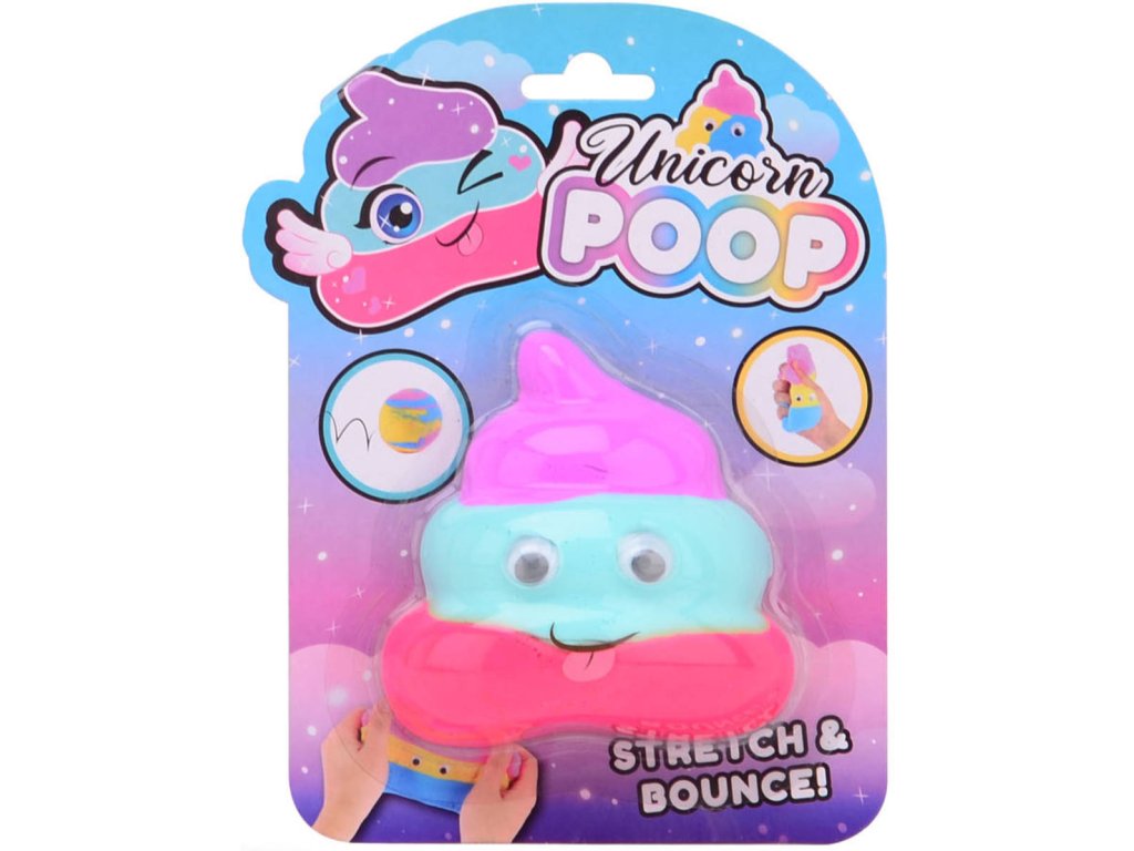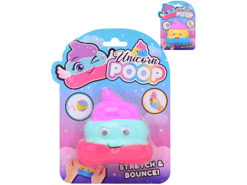 Tříbarevná strečová mačkací a skákací hmota s očima Unicorn Poop, duhové antistresové hovínko, 2 barevné varianty.