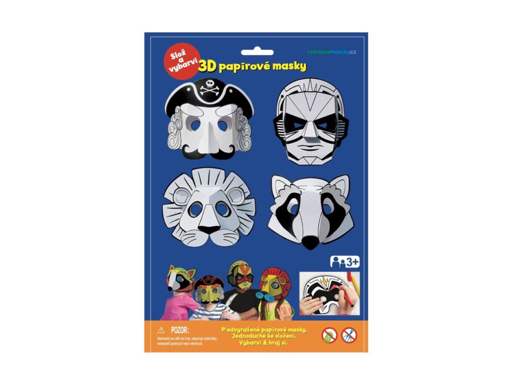 Papírové karnevalové masky - 4 ks - pirát, superhrdina, lev, mýval. Předvyražené masky slož podle obrázkového návodu a vymaluj si. Sada obsahuje 4 různé masky, gumičku, obrázkový návod. Barvy nejsou součástí balení. Masky jsou vyrobeny na kvalitním tvrdém papíru.