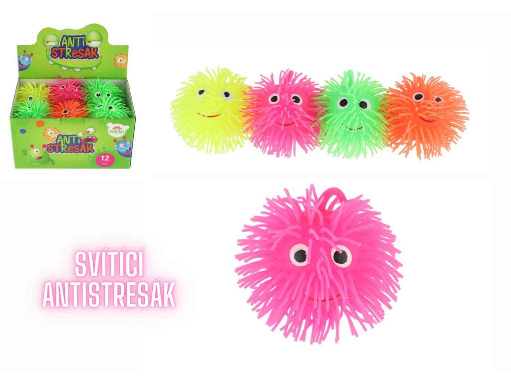Míček chlupatý antistresový mačkací silikon 8cm na baterie se světlem 4 barvy v sáčku 12ks v boxu