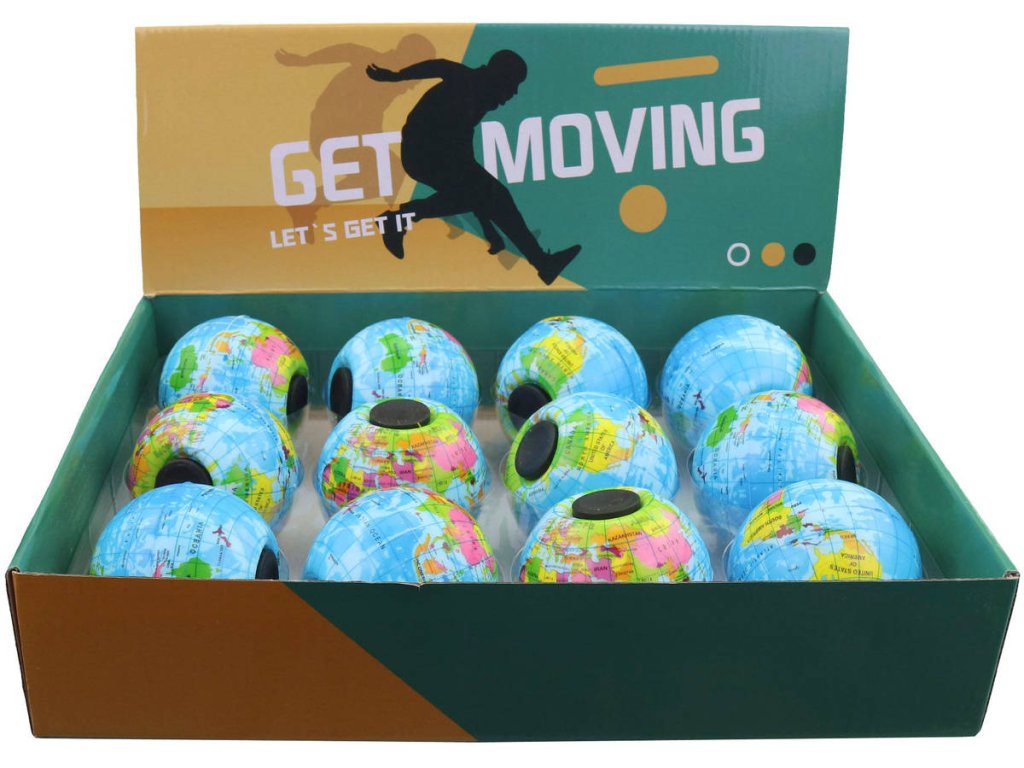 Gumový míček s potiskem zeměkoule, balonek spinner točící se kolem své osy. Antistresová hračka pro neklidné ruce, k odbourání stresu. Velikost 8cm.