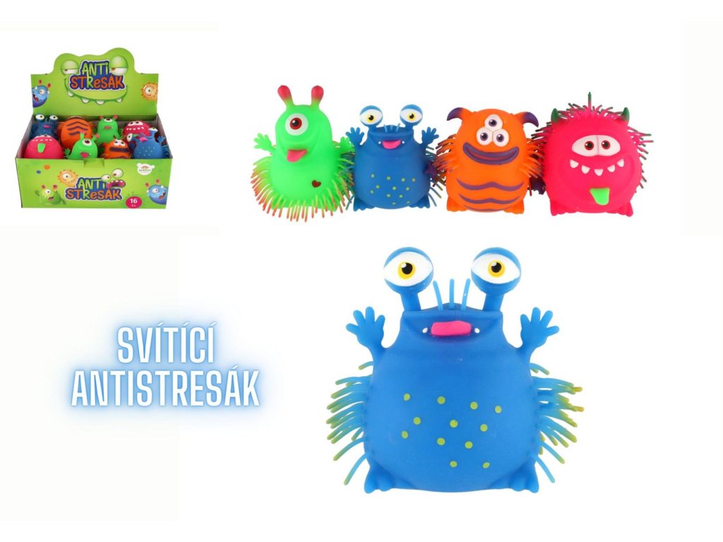 Míček příšerka antistresový mačkací silikon 11cm na baterie se světlem 4 druhy v sáčku 16ks v boxu