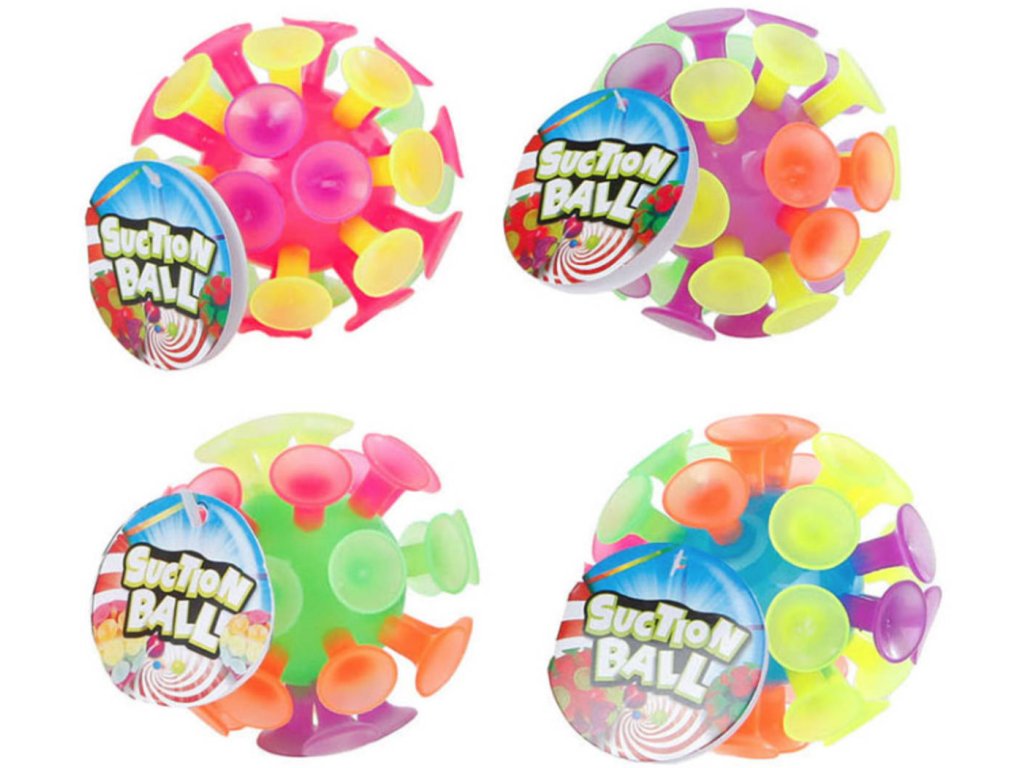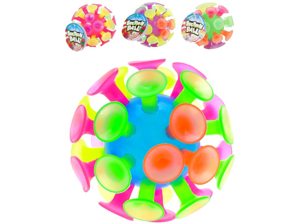 Originální měkký pestrobarevný míček s přísavkou. Skákací balónek s výstupky. 4 barevné kombinace.