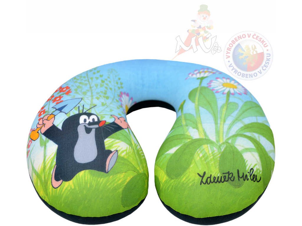 Opěrka hlavy pro děti, s motivem Krtečka, z pružného materiálu, naplněná jemnými polystyrenovými kuličkami pro pohodlí při cestování. Pratelné. Vyrobeno v ČR.