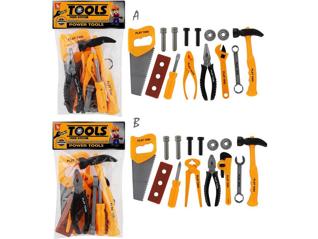 Pěkný plastový herní set obsahující dětské pracovní nářadí s doplňky, ve dvou variantách provedení, pro všechny malé kutily a opraváře. Balení obsahuje celkem 14ks. Baleno v sáčku.