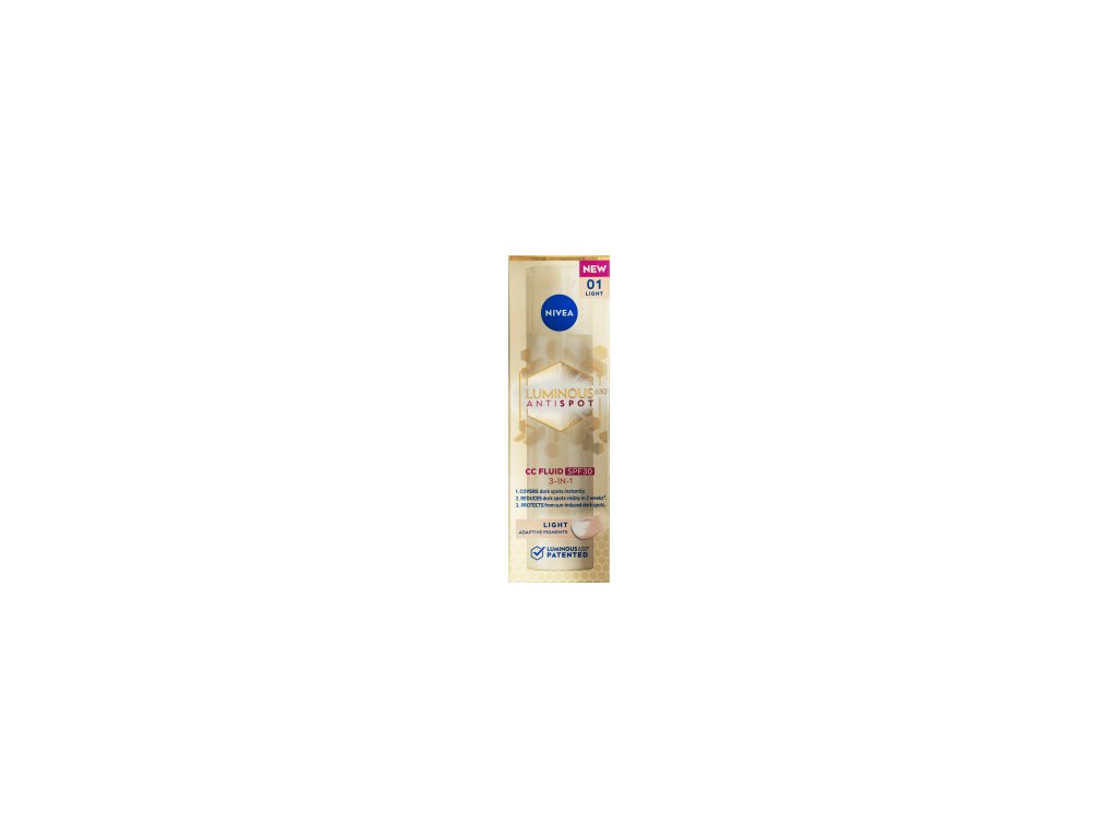 Nivea® CC Krém Luminous630® OF 30 ve světlém barevném odstínu zdokonalí pleť trojím účinkem. Pro sjednocenou, rozjasněnou a bezchybnou pleť. Viditelné výsledky za 2 týdny.