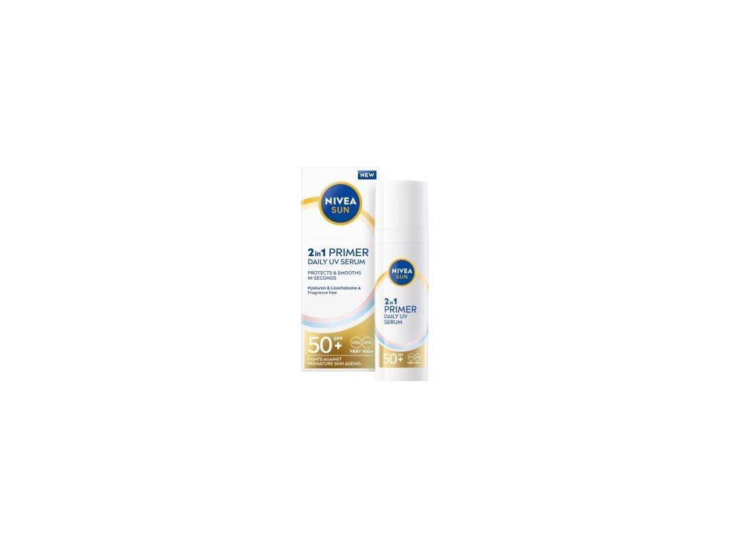 NIVEA Sun 2v1 pleťové sérum s vysokým ochranným faktorem SPF 50+ poskytuje účinnou ochranu před UVA a UVB zářením i před škodlivým modrým světlem (HEVL), které přispívá k předčasnému stárnutí pleti. Sérum má lehkou, nemastnou texturu, která se rychle vstřebává, nezanechává bílé stopy a je vhodné jako podklad pod make-up. Je určeno pro všechny typy pleti, včetně citlivé, a lze jej používat i v oblasti očí.