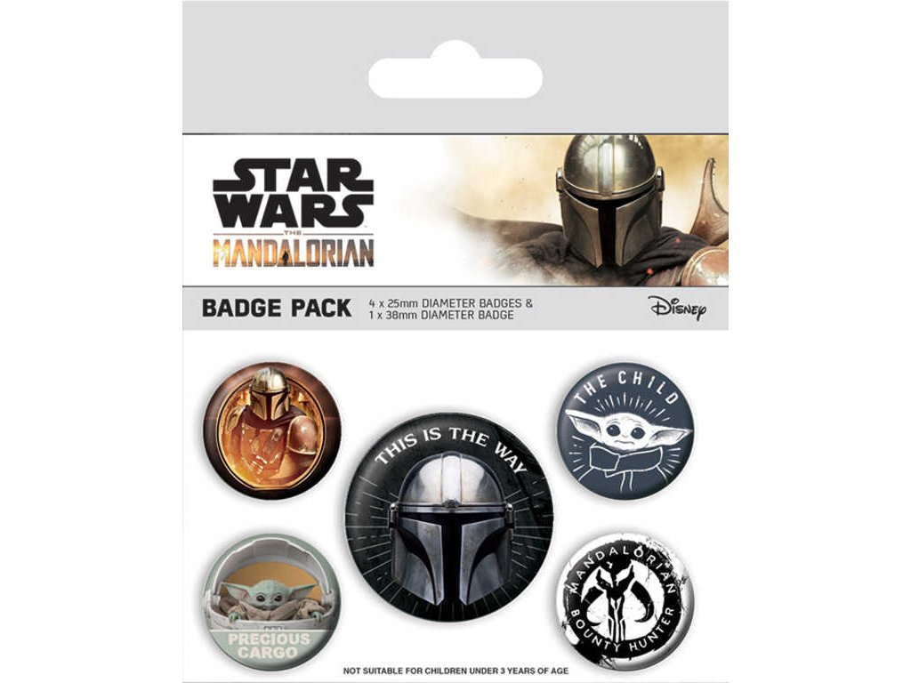 Sada pěti kulatých odznaků v licenci Star Wars: Mandalorian. V balení najdeš jeden větší a čtyři menší odznáčky.