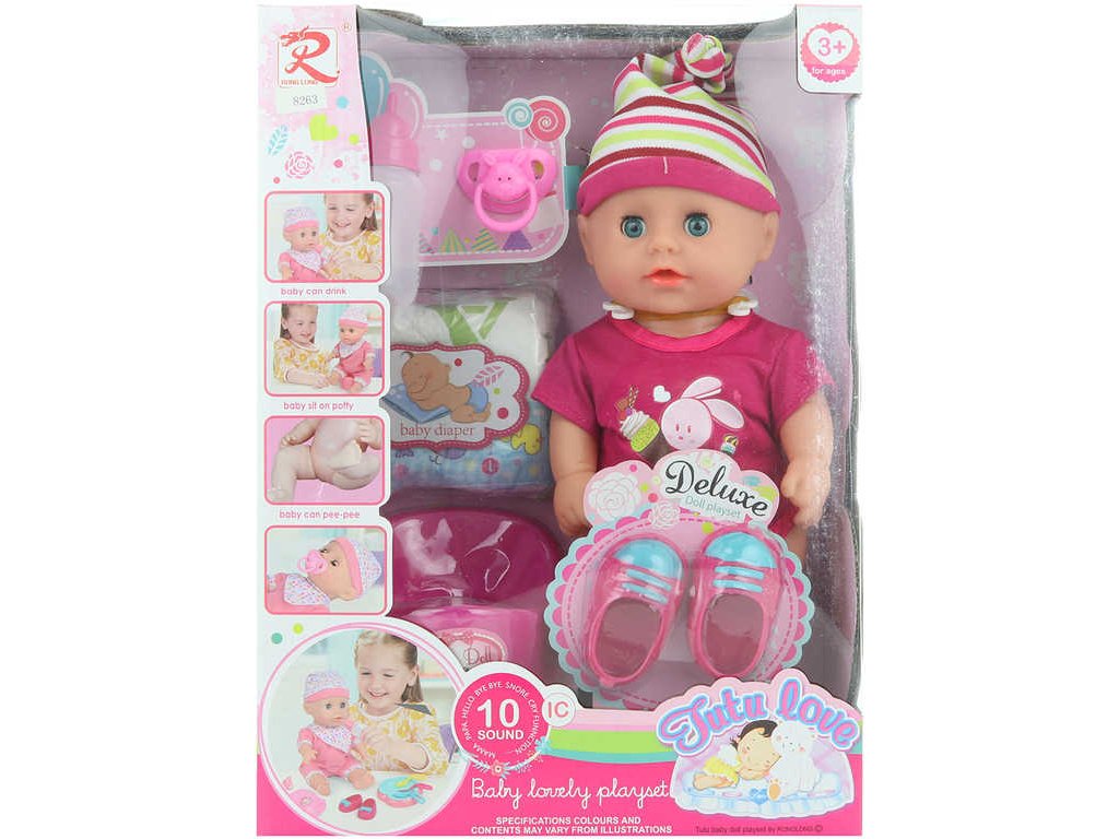 Panenka po vložení baterií vydává zvuky (celkem 10) a čůrá. Balení obsahuje také botičky pro panenku, plastový bryndáček, lahvičku, talířek a další doplňky.