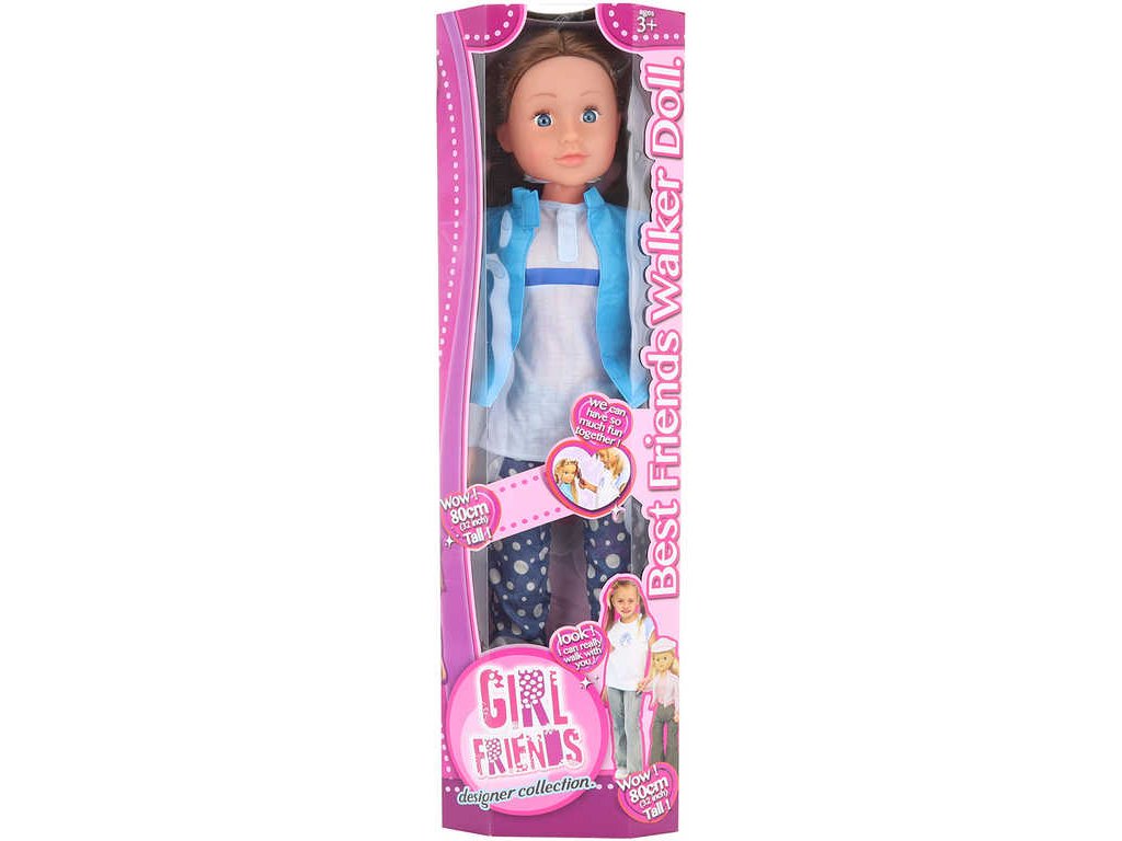 Krásná velká chodící panenka s tmavě hnědými vlásky. Panenka má pohyblivé nohy a ruce a lze s ní chodit - držením za ruce a tažením panenky vpřed se automaticky pohybují i nohy. (mechanická