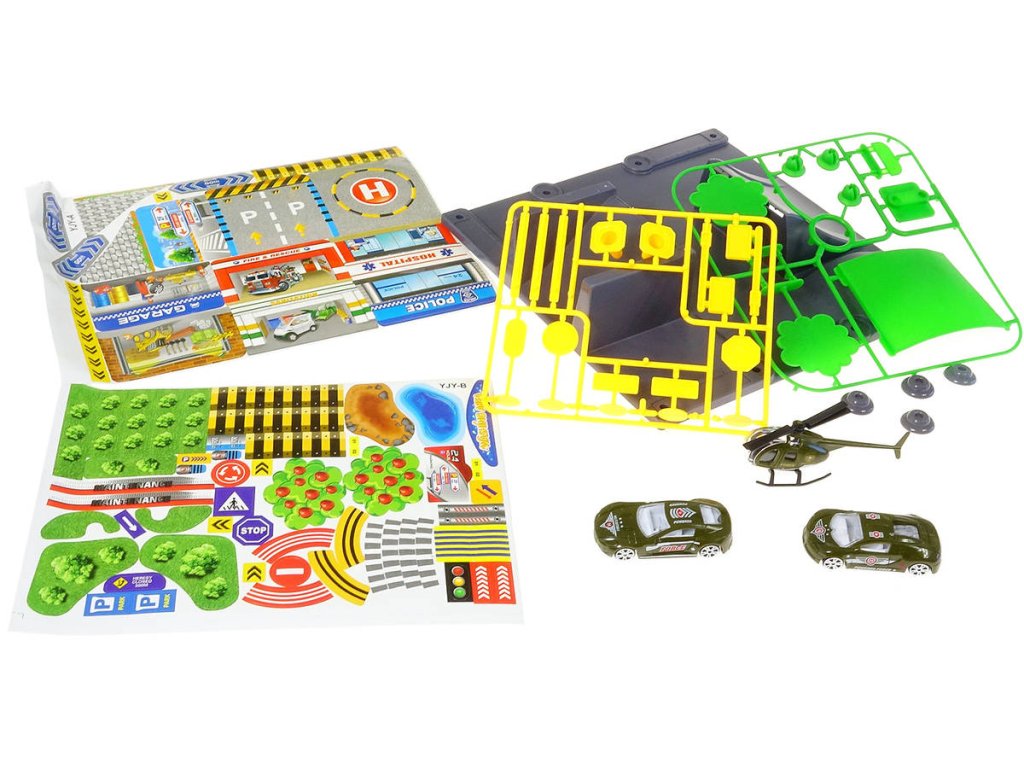Obsah balení: model garáže, dopravní značky a značení, samolepky, vegetace, auto 2ks, vrtulník