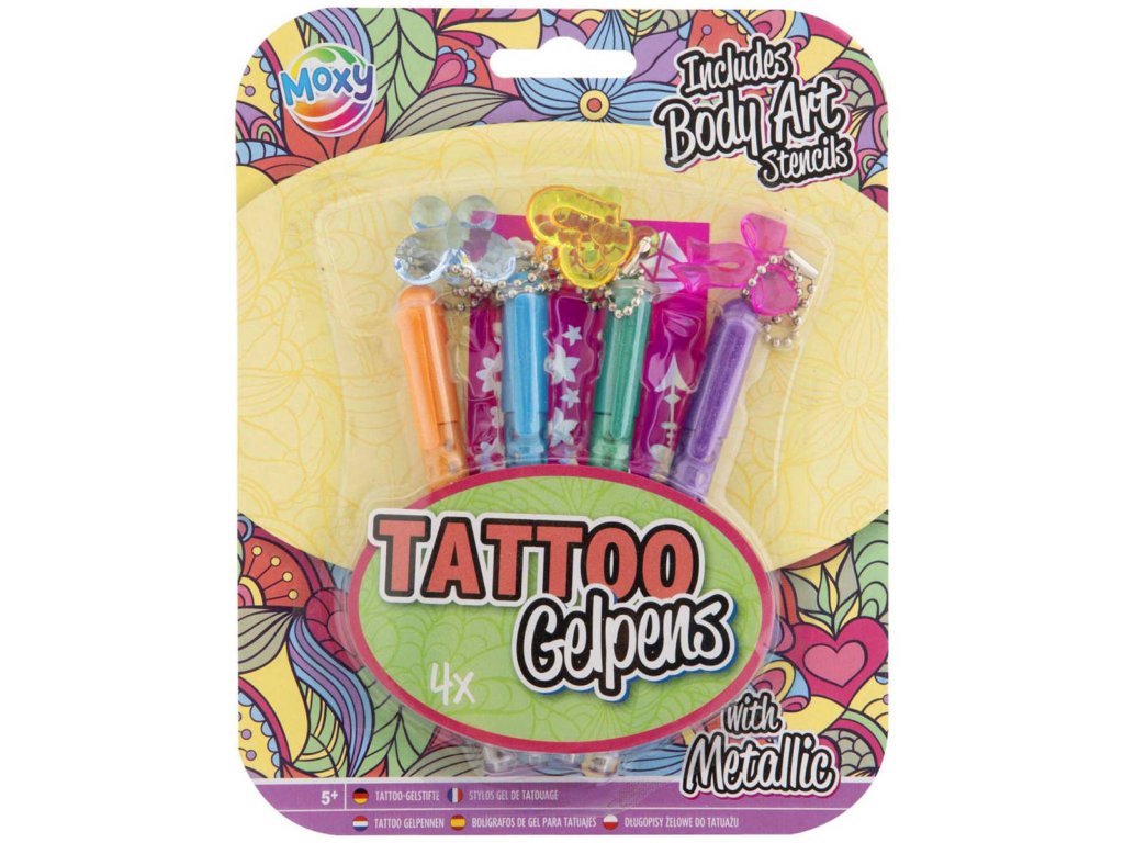 Sada čtyř metalických tetovacích gelových per v různých barvách se šablonami. Tetovací gelová pera, díky kterým si můžete jednoduše vytvořit vlastní parádní třpytivé tetování. Vytvořte si vlastní tetování. Sami si určíte, kam a jaké tetování umístíte a jakou barvu mu dáte! Umístěte šablonu na své tělo a vybarvěte ji. Sada obsahuje list šablon a 4 gelová pera v barvách modré, fialové, zelené a oranžové.