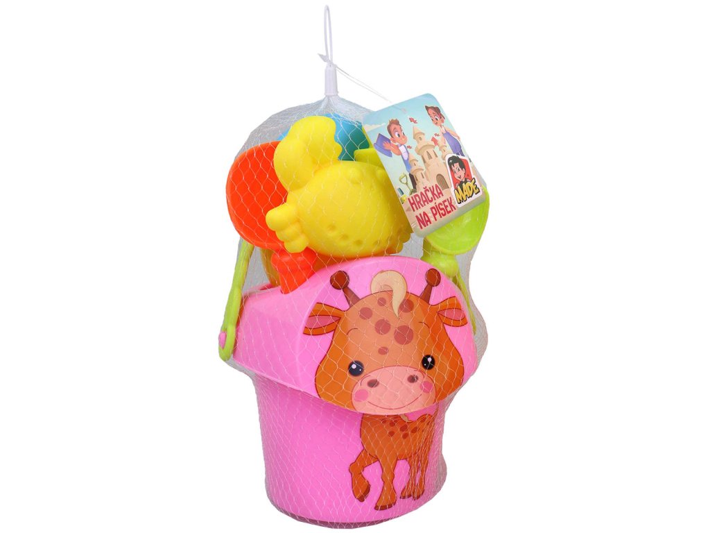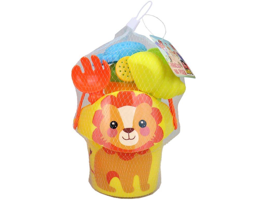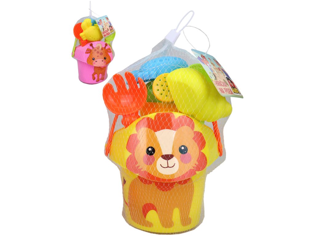 Dětská sada na písek. Součástí kyblík se zvířátkem, síto, 2 pracovní nástroje (lopatička, hrabičky), konev a 2 formičky s mořskými motivy (krab, hvězdice, mušle atd.). 3 varianty provedení kyblíku.
