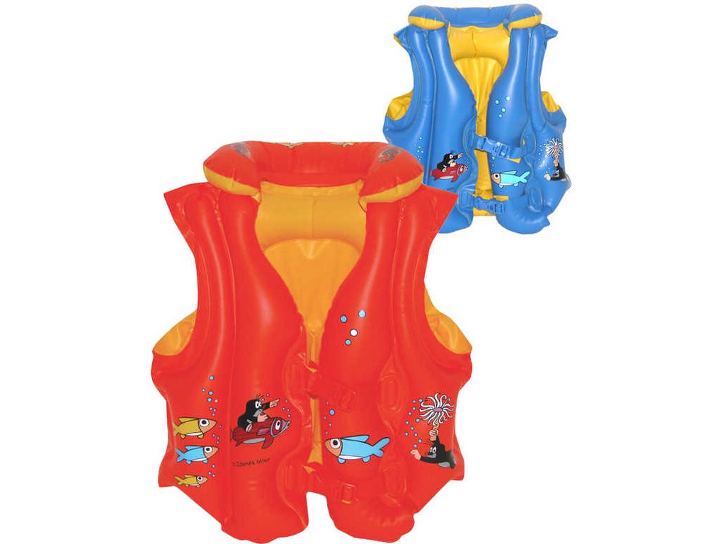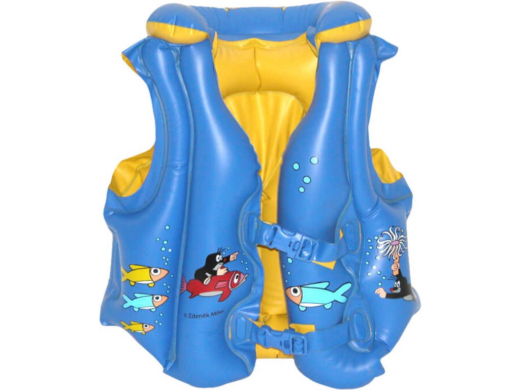 Nejen kruhy a rukávky zajistí bezpečí vašich dětí u vody. Co takhle plavací vesta? To je také správná volba. Dětská plavací vesta ve dvou barevných variantách, s motivy Krtečka a jeho kamarádů, je skladná, bezpečná, snadno se nafukuje a vyfukuje. Je bez ftalátů a s bezpečnostními ventily. Děti mohou využít vestičku buď ke hře ve vodě nebo k výuce plavání. Vesta má nafukovací límce a nastavitelné přezky. Baleno v sáčku.