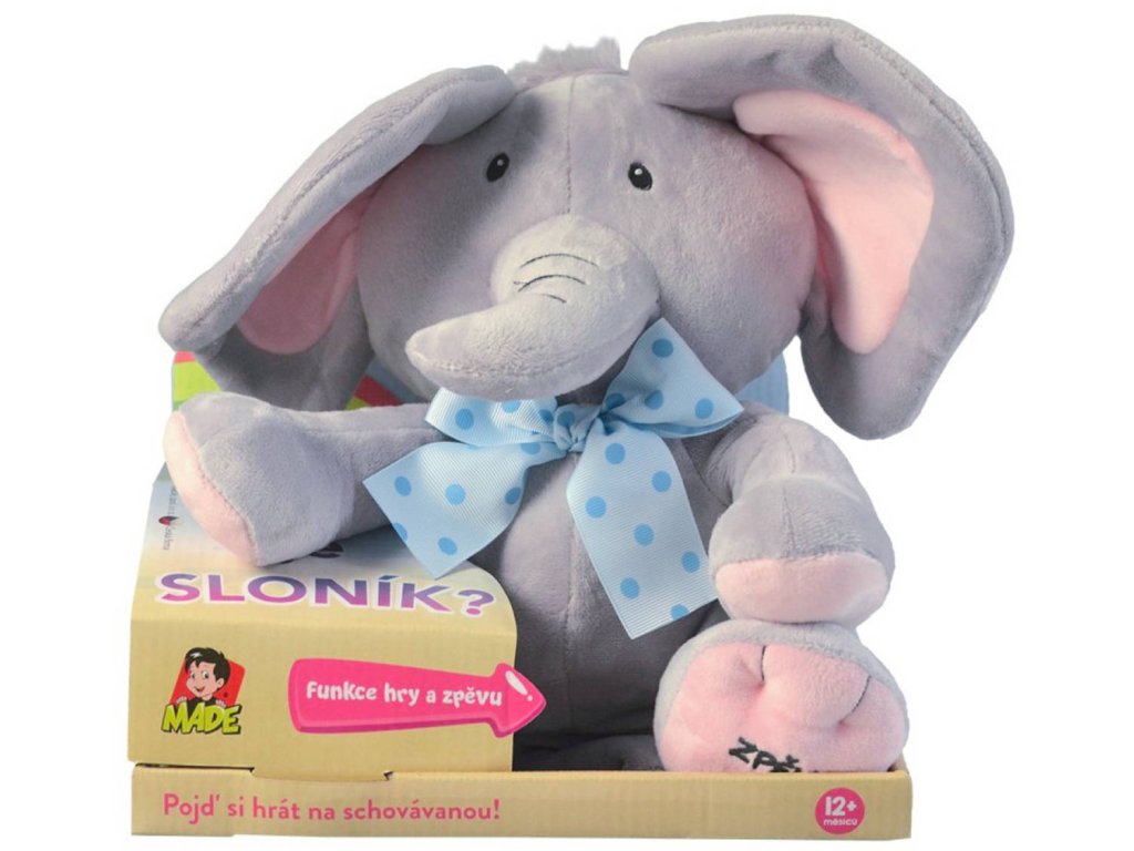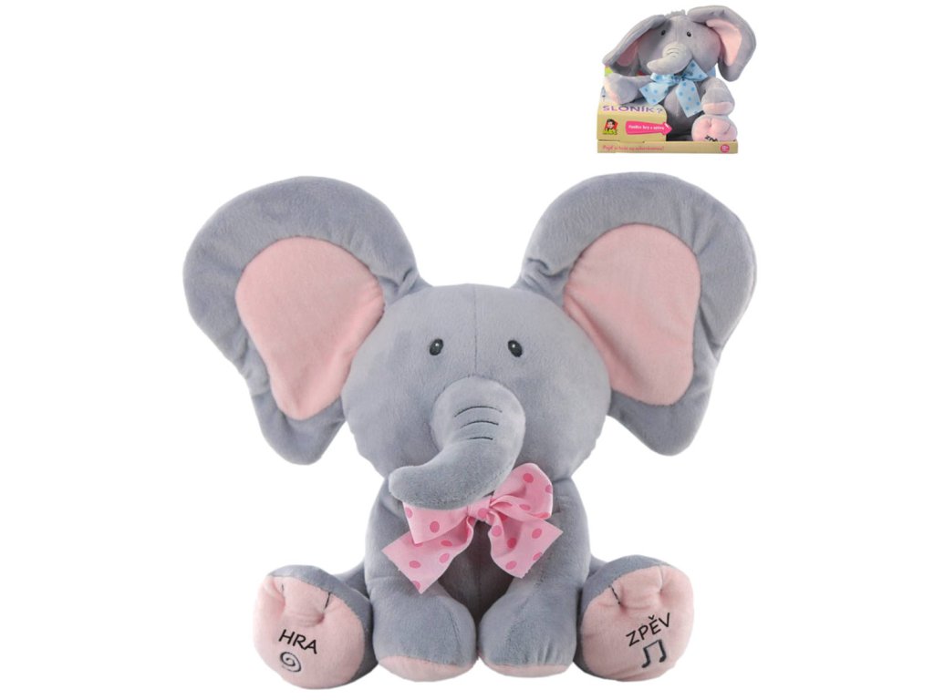 PLYŠ Sloník baby hra na schovávanou mluví zpívá na baterie CZ Zvuk 2 barvy