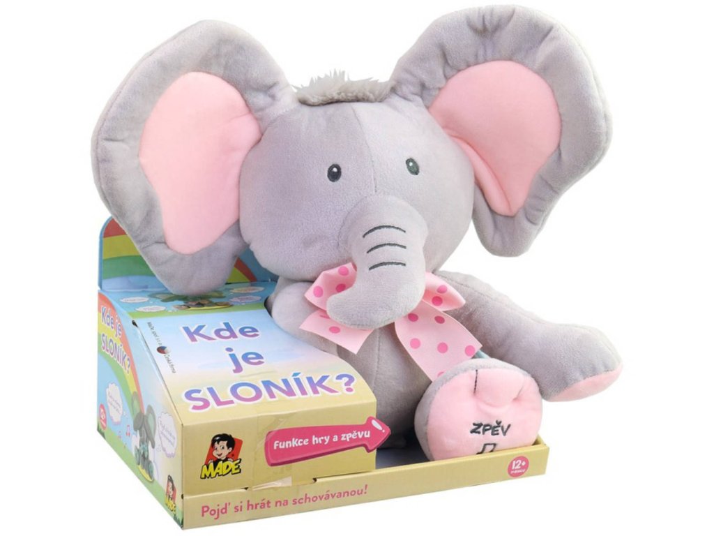 Sloník se hrou na schovávanou. Kdopak se to schovává? Kuk! To jsem já, tvůj přítel Sloník! Umím mluvit, umím zpívat a rád si hraju na schovávanou. Stiskni mou levou tlapku a poslechni si veselou písničku nebo stiskni mou pravou tlapku a zahrej si se mnou na schovávanou. Sloník zpívá pěknou písničku a mluví česky. Hraje si s dítětem na schovávanou. "Najdi mě!" "Tady jsem!"