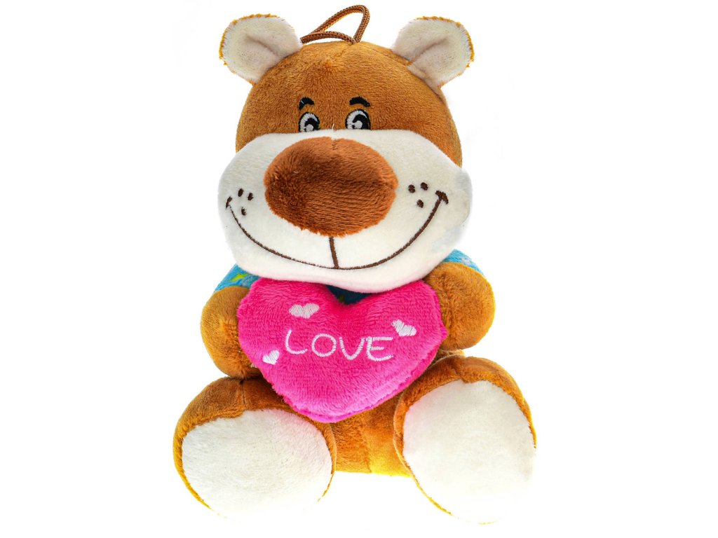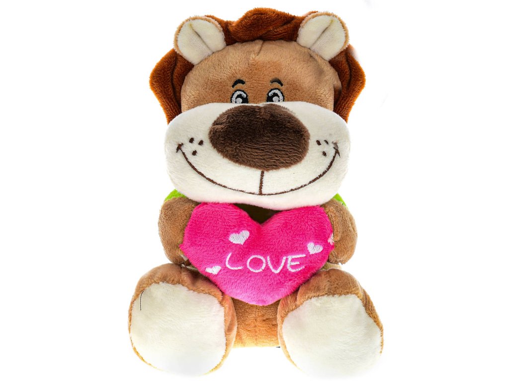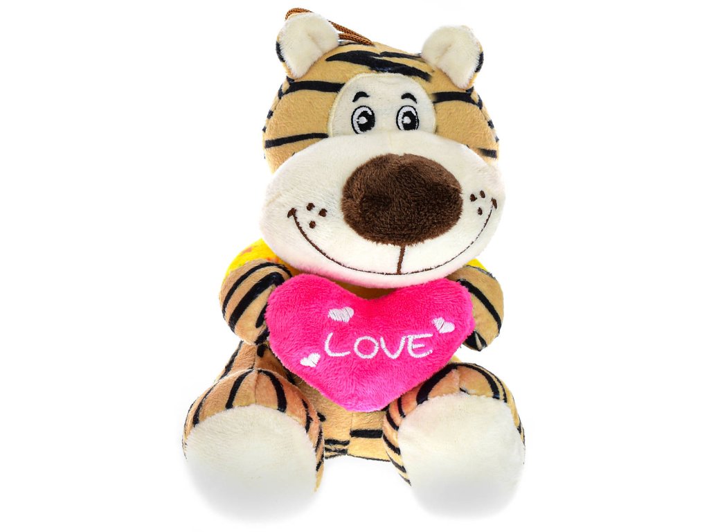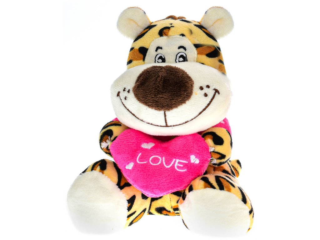 Veselé plyšové zvířátko, sedící plyšák s poutkem, srdíčko "Love", 5 variant, velikost 15cm. Vhodné jako dárek z lásky, pro zamilované, na Valentýna. Lvíček, tygřík, leopard (levhart), medvídek, opička.