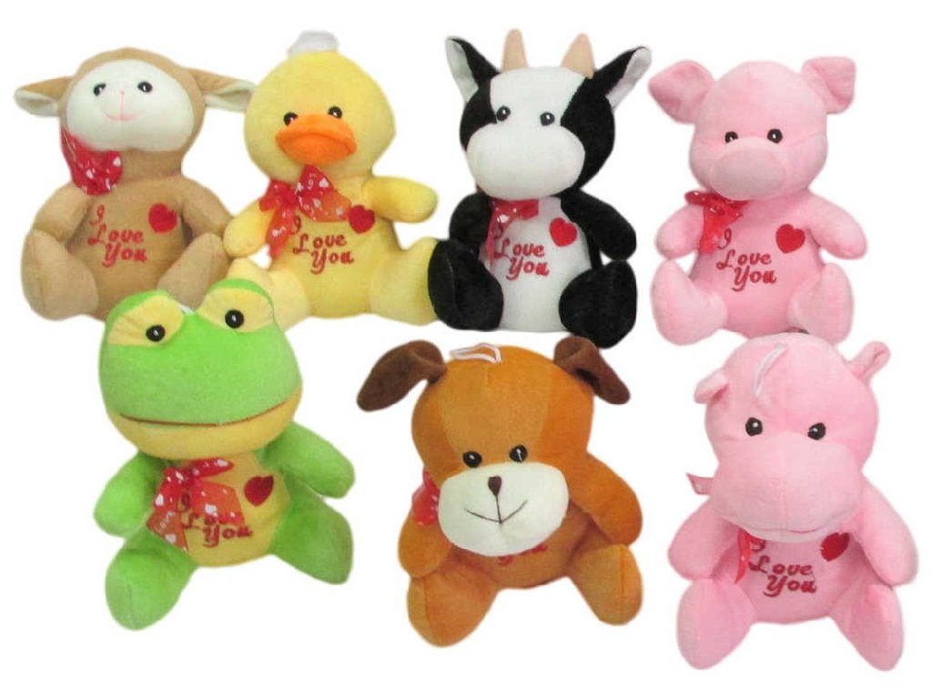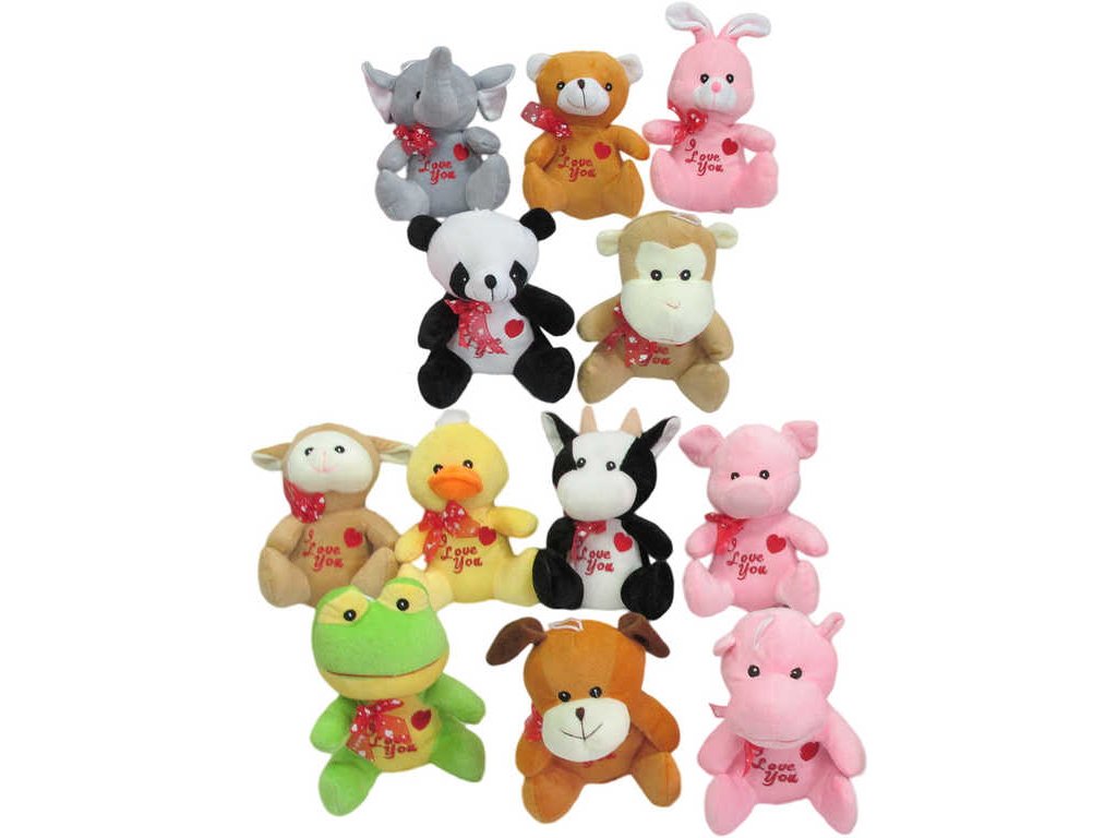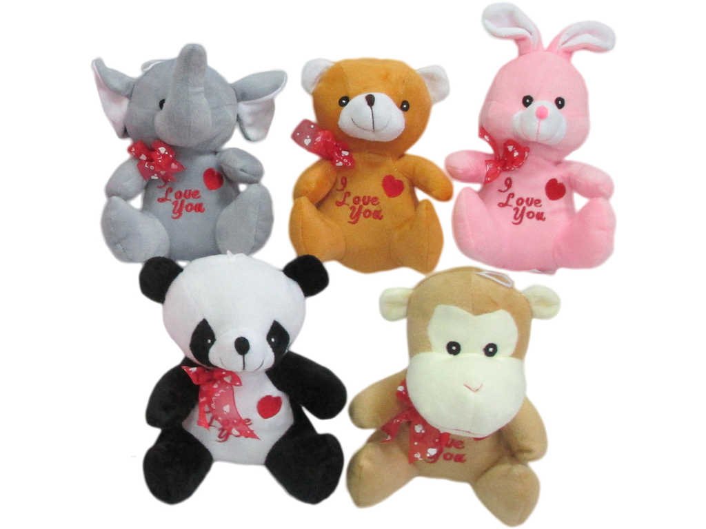 Veselá zvířátka z plyše, s červenou mašlí na krku a se srdcem, ve dvanácti variantách provedení (slon, medvídek, kravička, ovečka, káčátko, žabička, prasátko, panda, zajíček, pejsek a další). Vhodné jako dárek k Valentýnu.