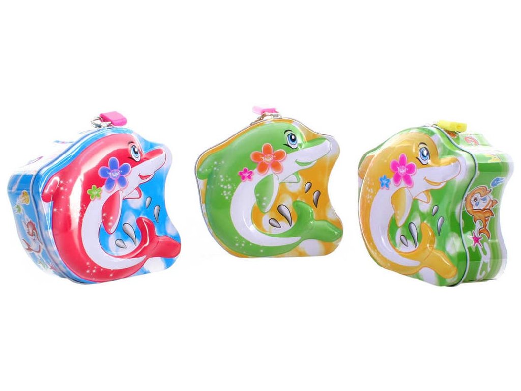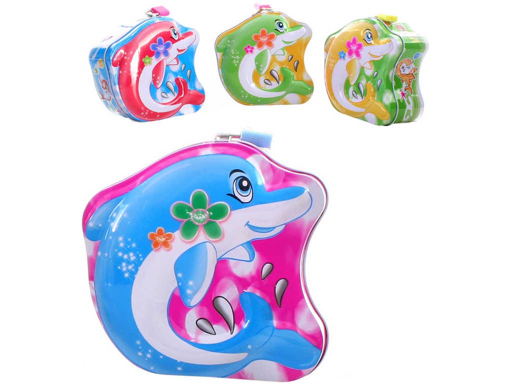 Krásná kovová pokladnička na zámek ve tvaru delfína pro děti, ve čtyřech barevných variantách. Baleno v sáčku, se dvěma klíčky.