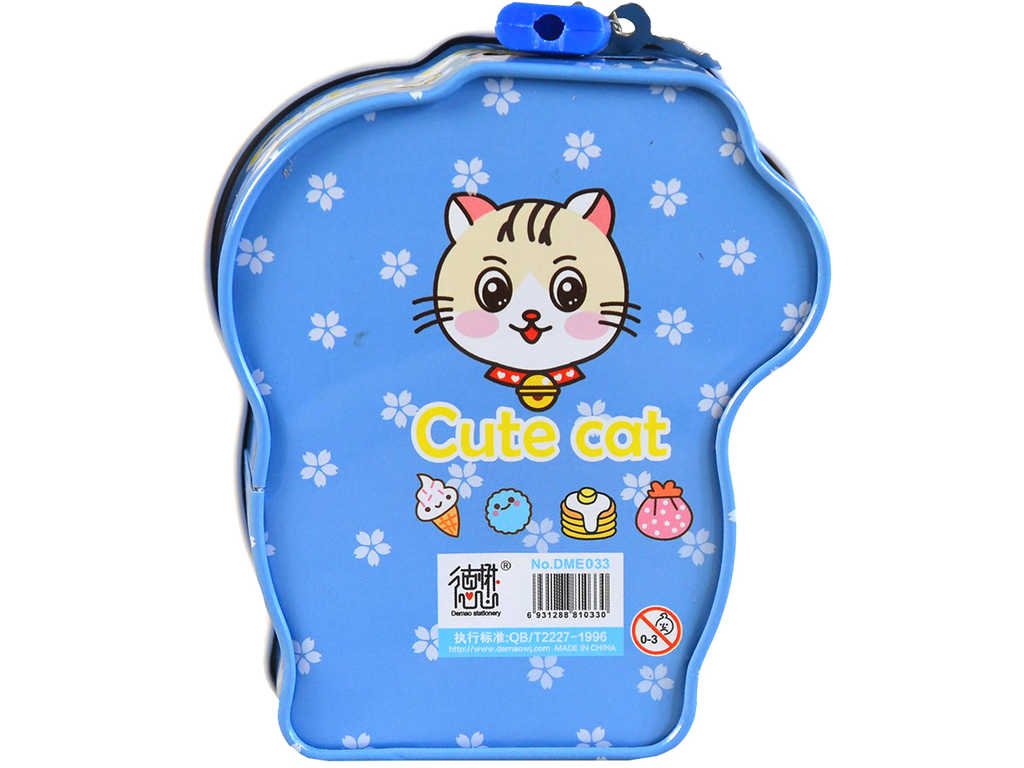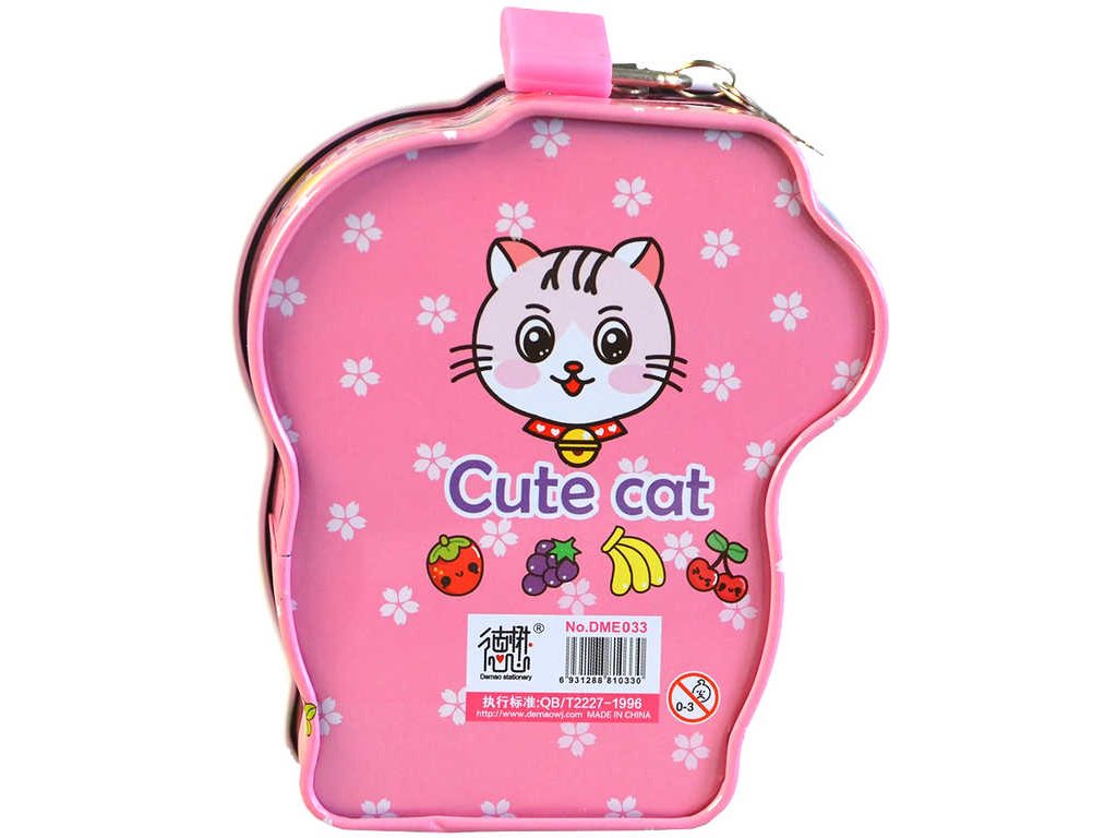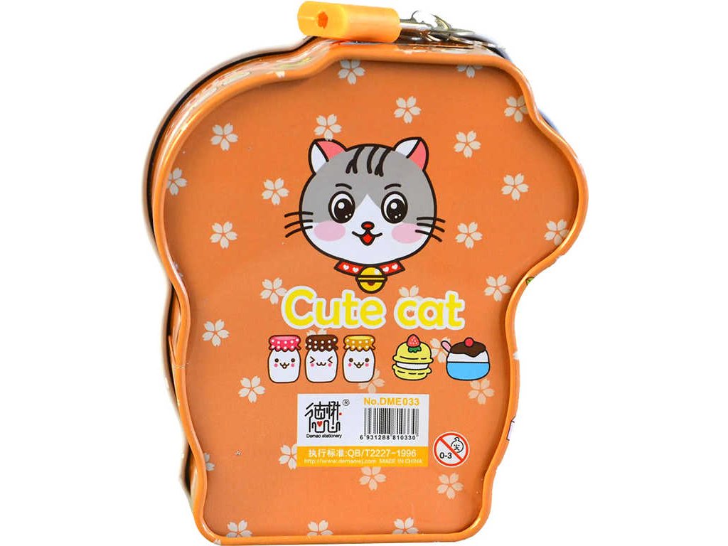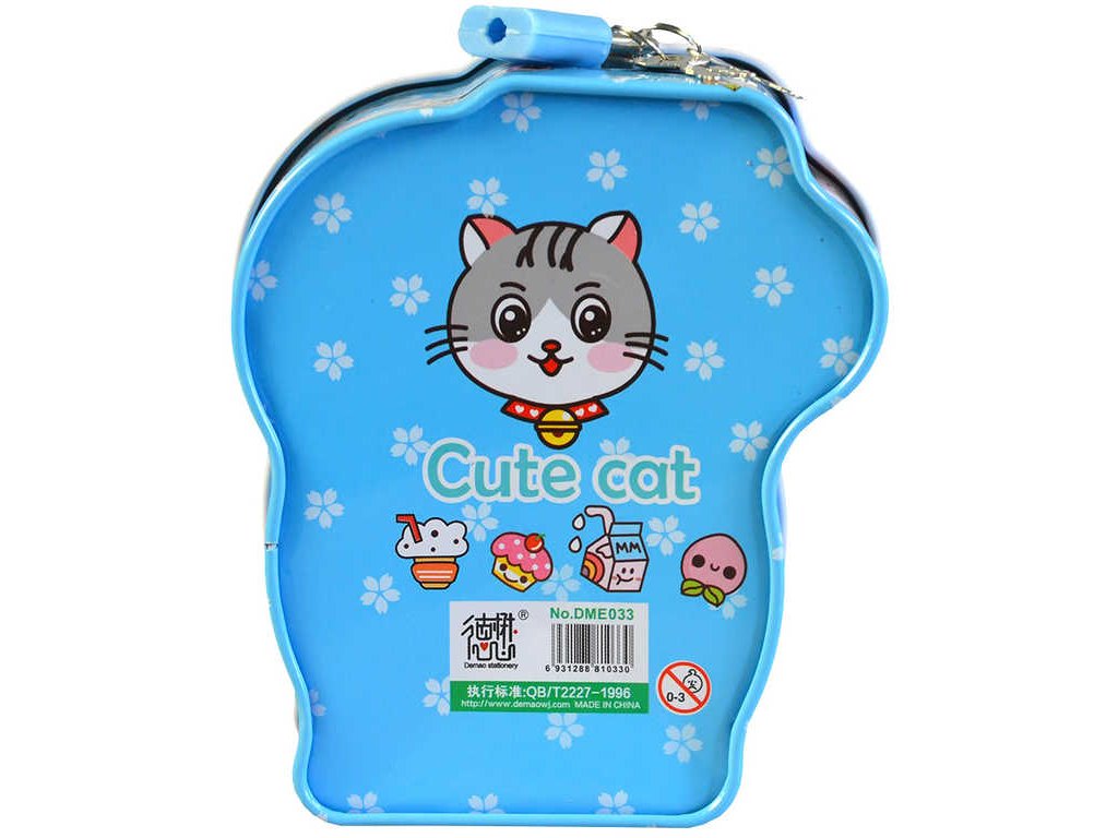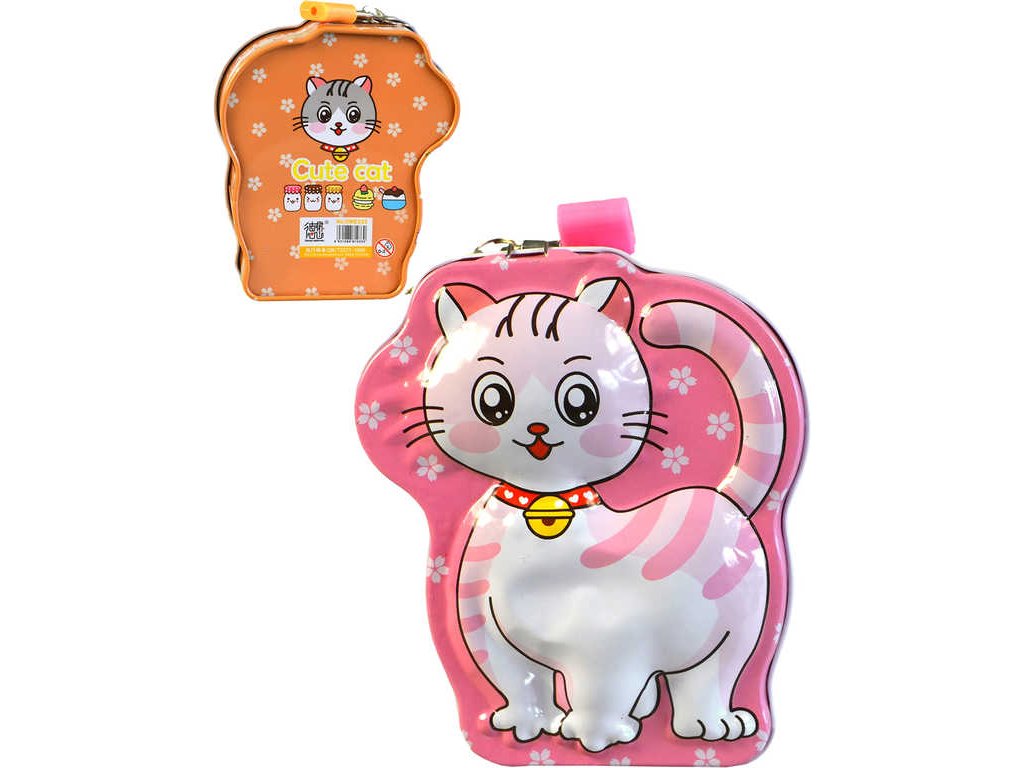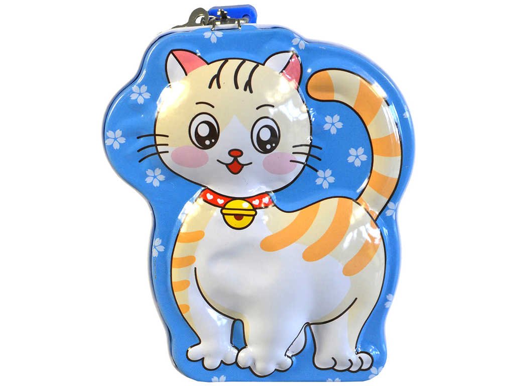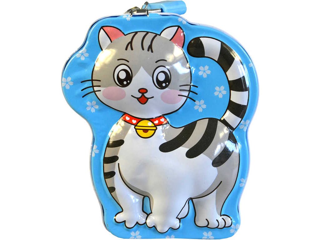 Originální plechová reliéfní pokladnička ve tvaru kočičky, ve čtyřech barevných variantách, s uzamykáním na zámek, pro všechny malé šetřílky.