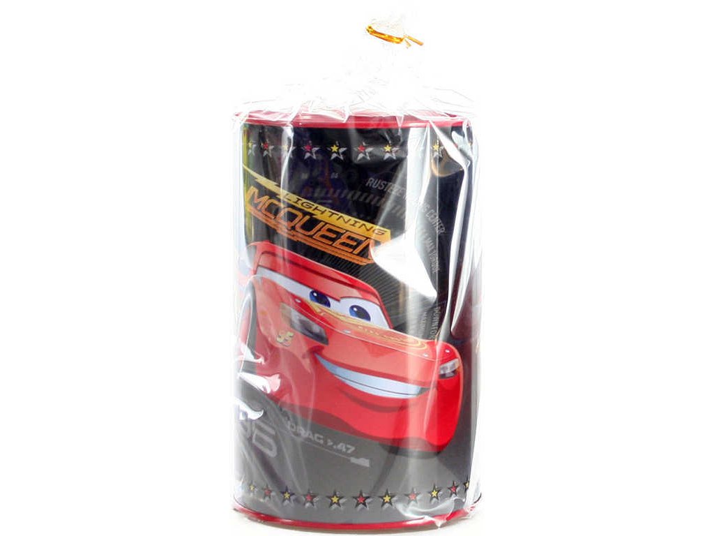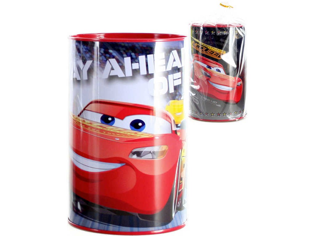Plechová kasička pro děti s motivem aut Cars, ve dvou variantách provedení. Baleno v celofánovém sáčku. Pokladnička nemá otvírání.