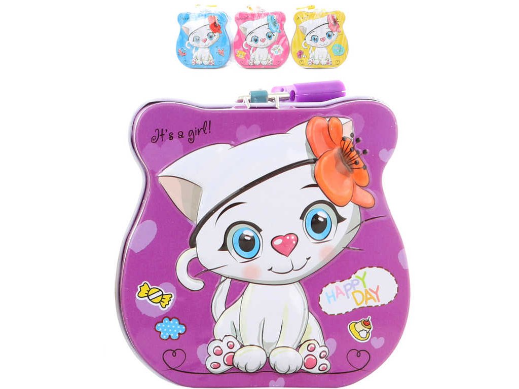 Pěkná kovová pokladnička s plastickým, reliéfním 3D motivem kočičky, ve čtyřech barevných variantách, pro všechny malé šetřílky. Otevírání v horní části. Součástí balení je zámek a dva klíčky, baleno v sáčku.