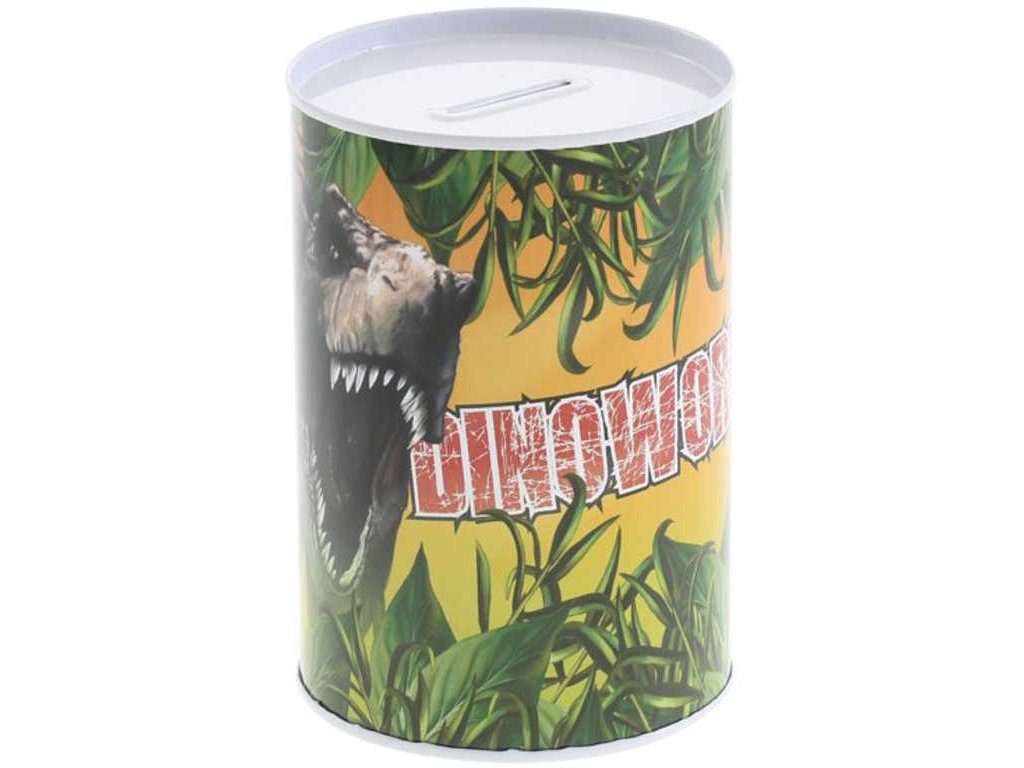 Pokladnička kovová dinosaurus 8x12cm kasička dětská válec