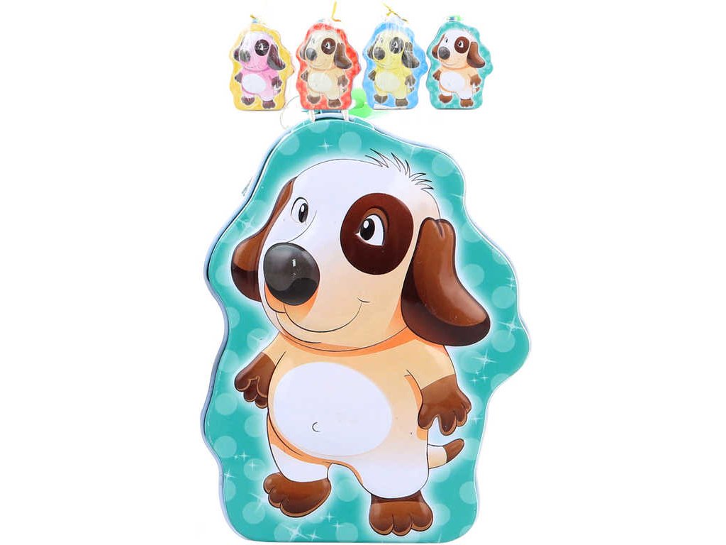 Pěkná kovová pokladnička s plastickým, reliéfním 3D motivem pejska, ve čtyřech barevných variantách, pro všechny malé šetřílky. Otevírání v horní části. Součástí balení je zámek a dva klíčky, baleno v sáčku.