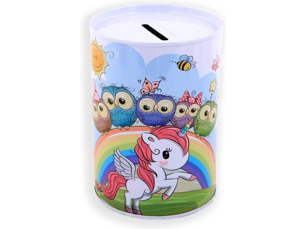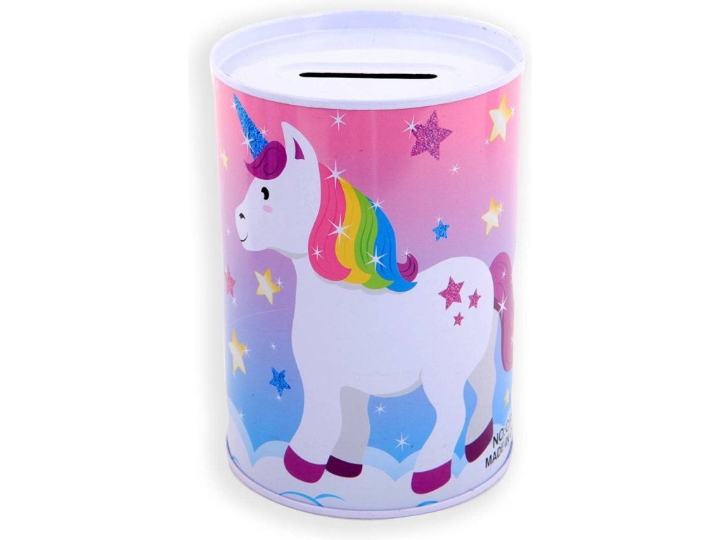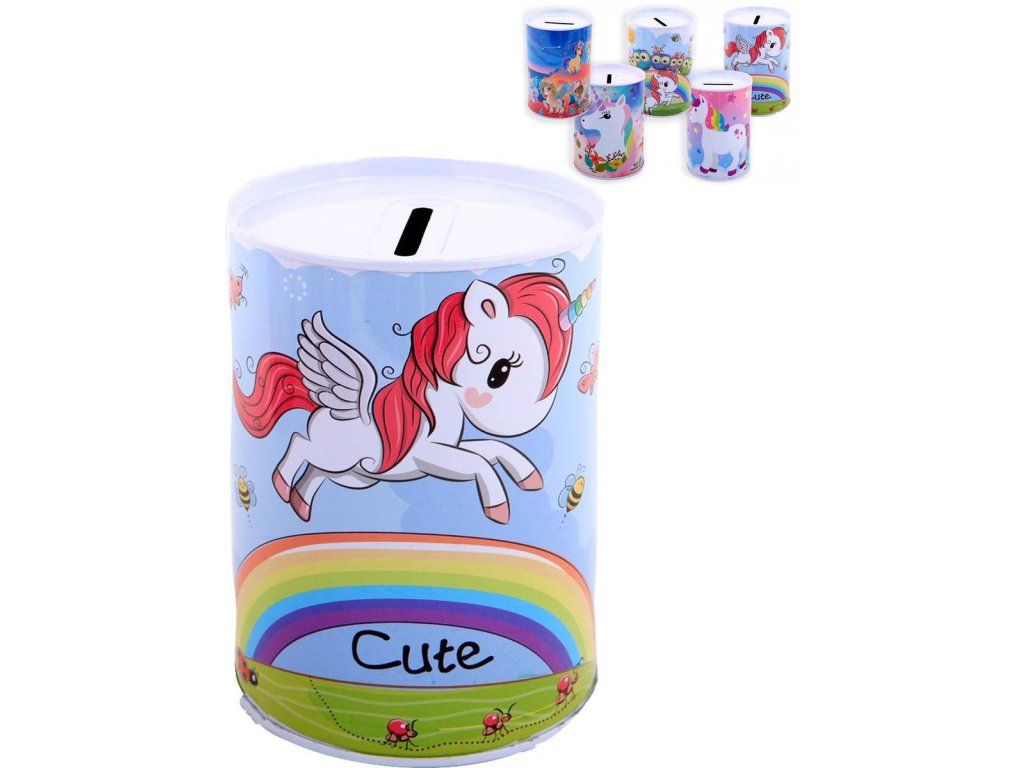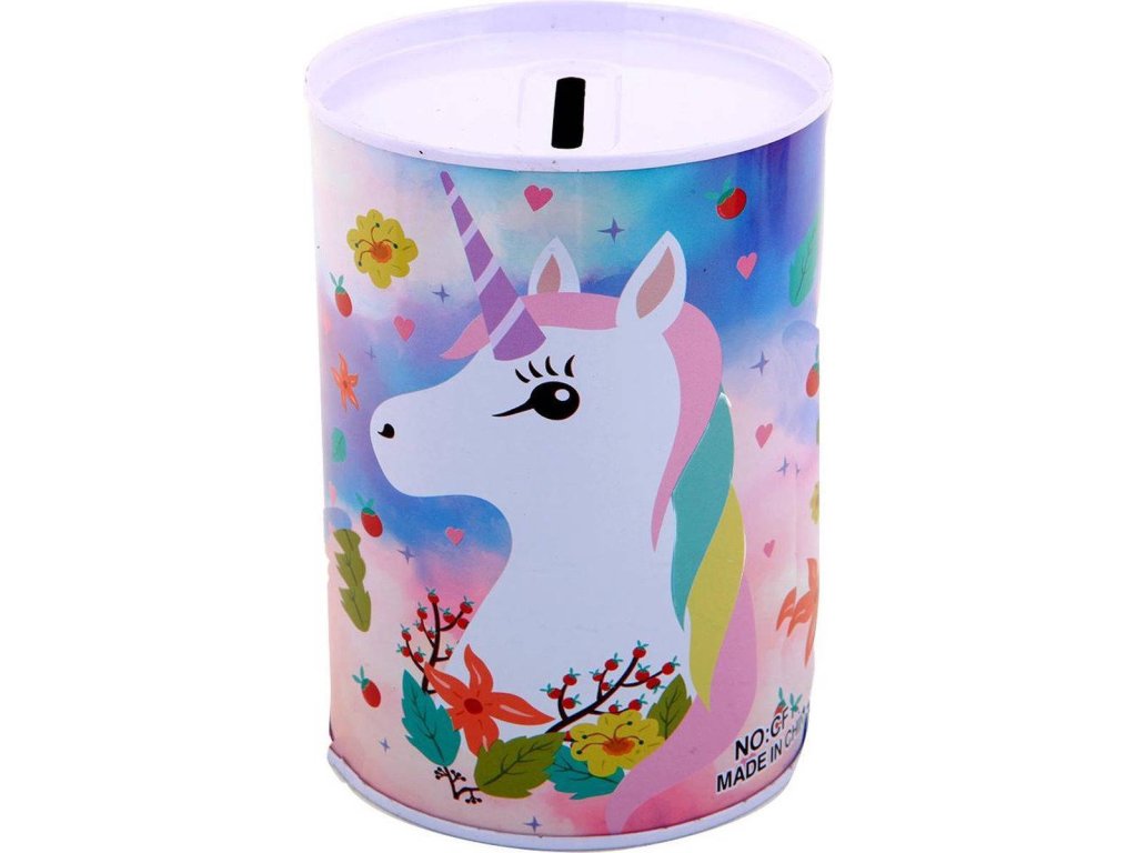 Pokladnička válec jednorožec 12cm dětská kasička plechová 5 druhů