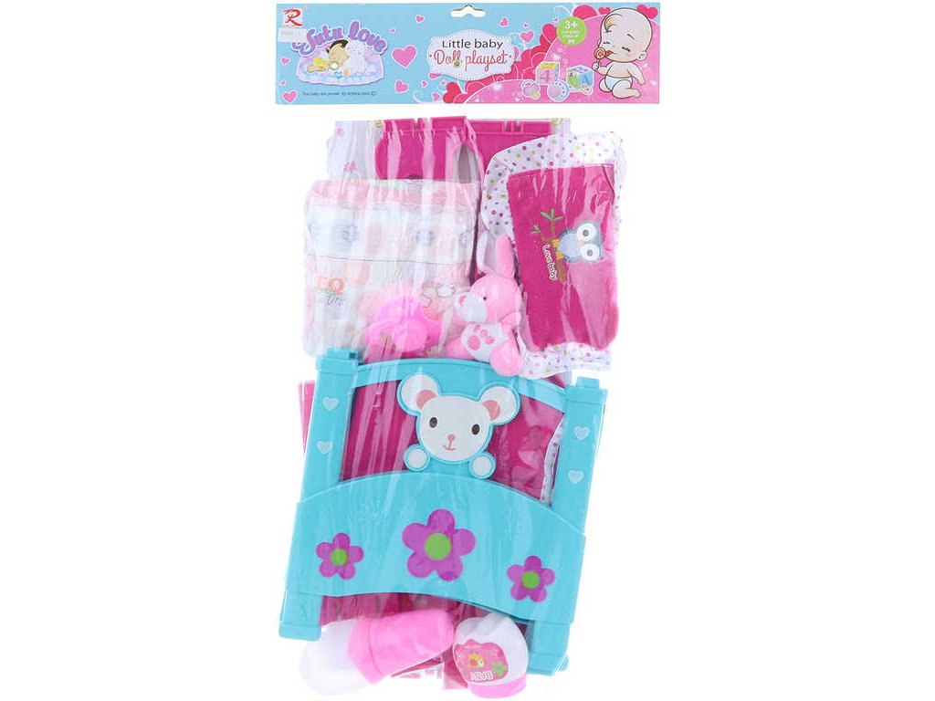 Postýlka růžovomodrá set s doplňky pro panenku miminko plast v sáčku