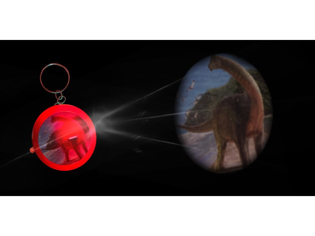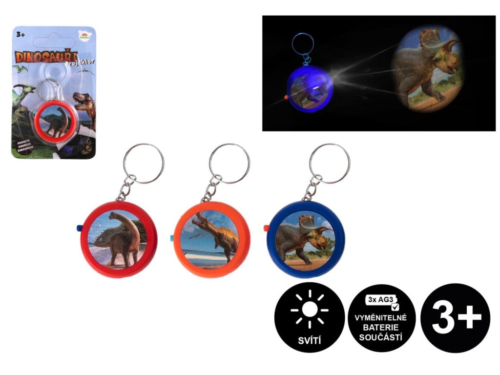 Projektor, který každý milovník dinosaurů a světýlek může nosit vždy po ruce, jako klíčenku. Zmáčkněte tlačítko na boku a celý se rozvítí, na zeď Vám bude promítat obrázek jednoho dinosaura.