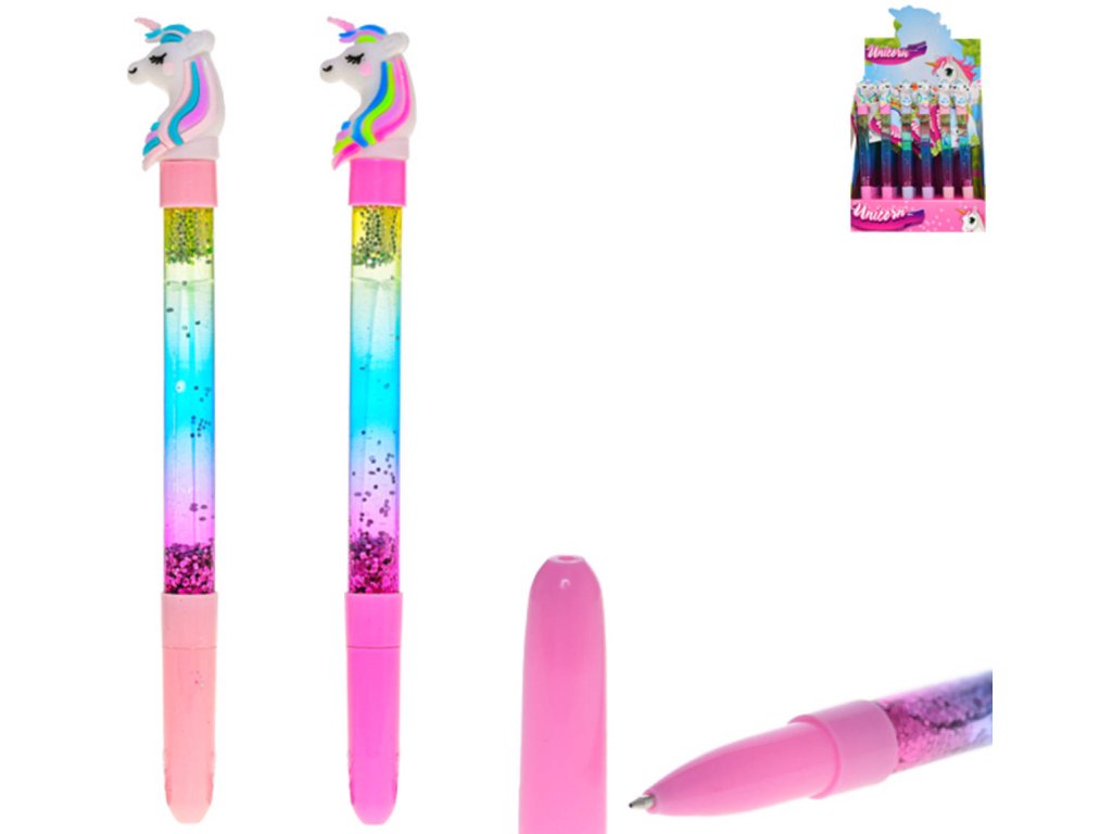 Dětská holčičí průhledná propiska jednorožec s tekutinou se třpytkami, v licenci Unicorn. Propisovací tužka pro holky. 2 barevné varianty.