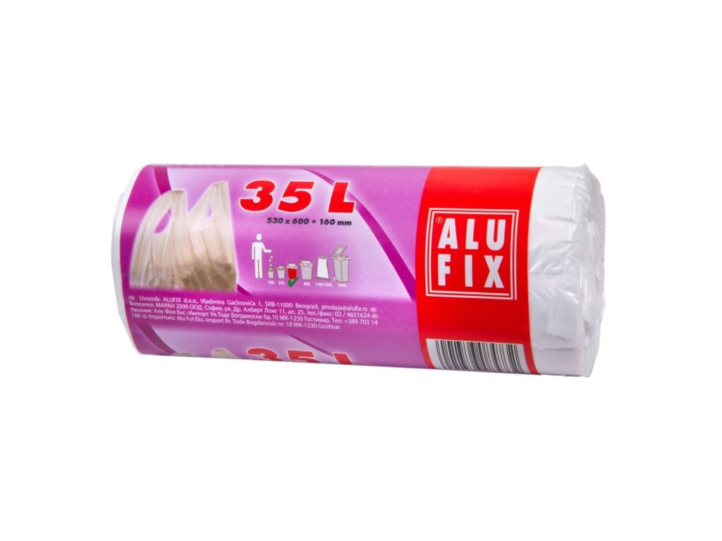 Alufix sáčky do odpadkového koše s uchy bílé, 10 µ, 35 litrů, 53 x 60 x 16 cm, 25 kusů. Praktické odpadkové pytle, které dobře poslouží v každé domácnosti nebo kanceláři. Pytle na odpad Alufix mají mnohočetné využití, jsou dennodenním pomocníkem v domácnosti, při třídění odpadu či udržování čistoty kolem domu.