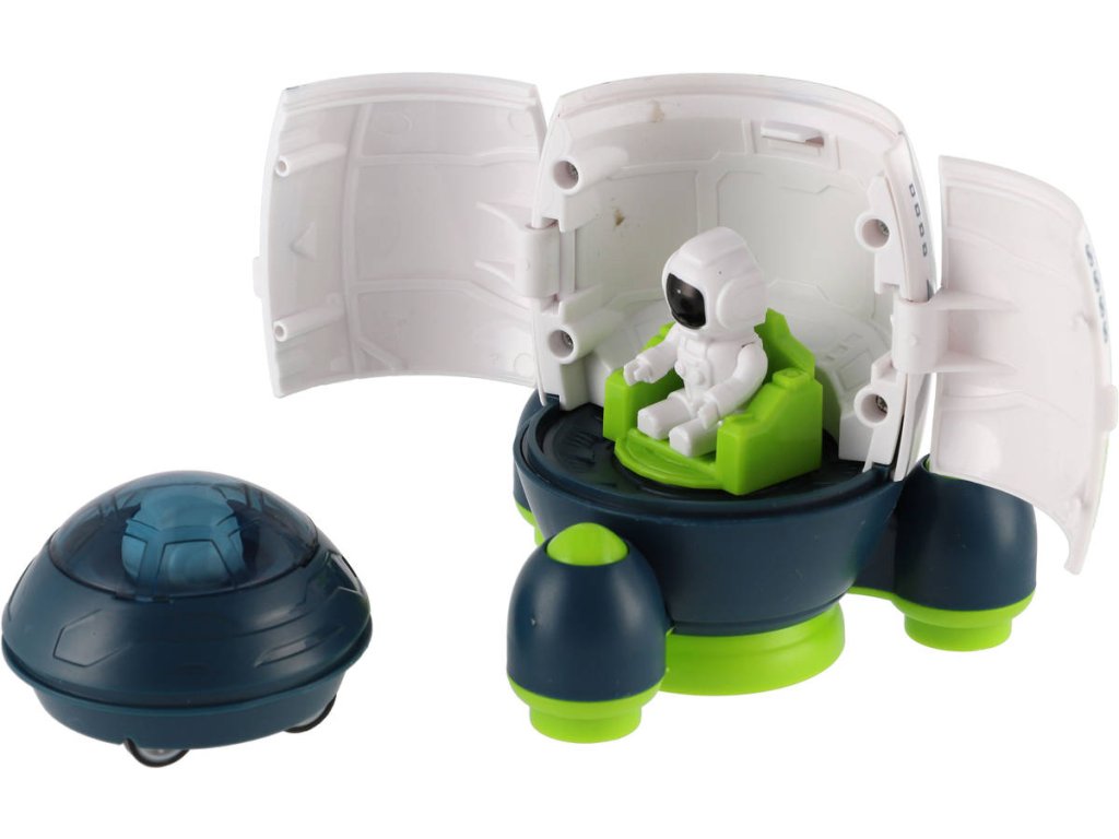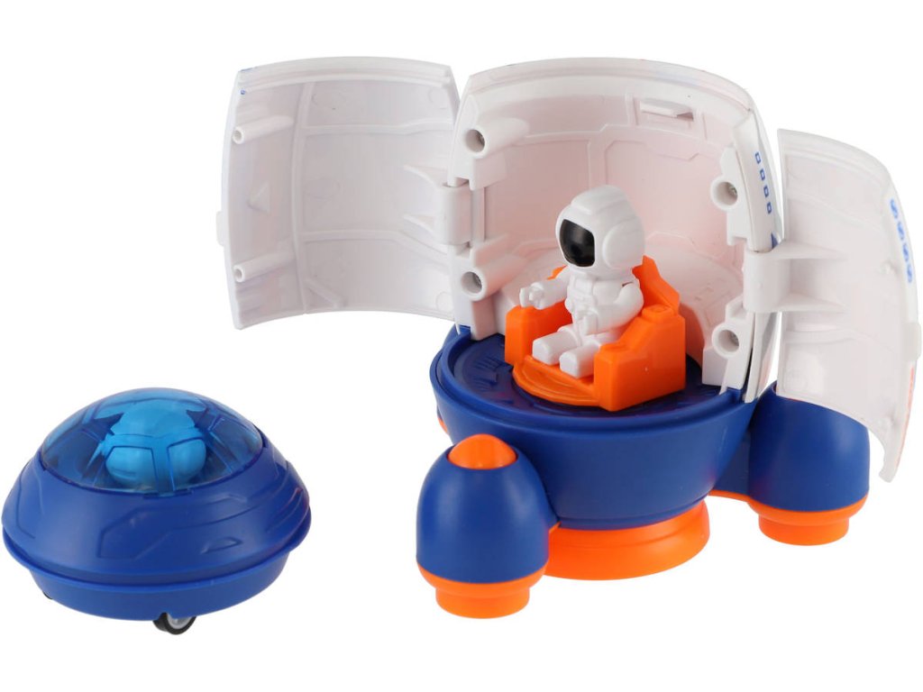 Plastová raketa s kosmonautem a vozítkem na setrvačník, ve dvou barevných variantách. Baleno volně.